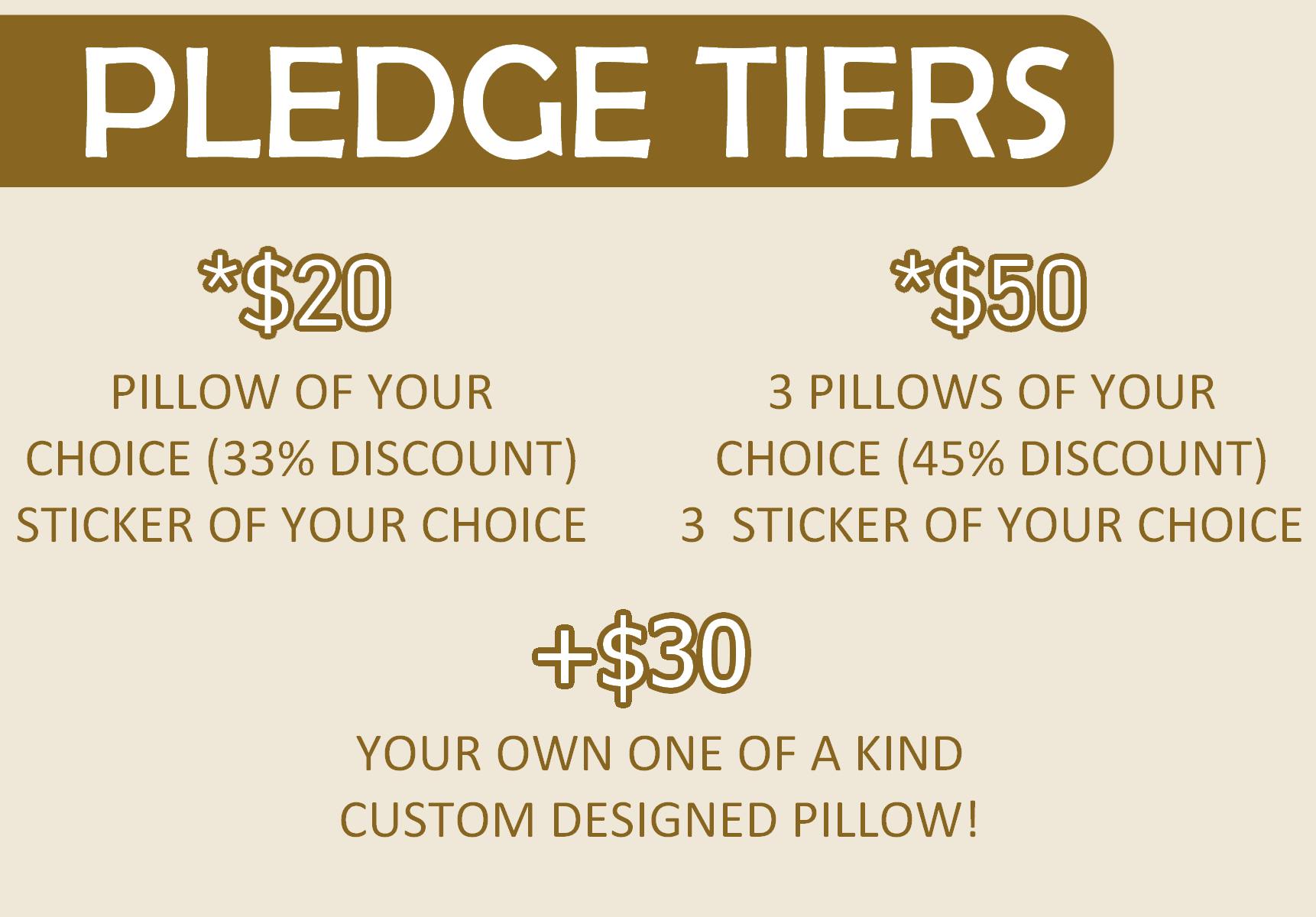 The basic $20 tier exists as essentially a 33% discount, or you can get a 45% discount on an order of 3 of the available pillows. You can also add on $30 to either tier to get a custom made pillow (PLEASE contact me through any avenue if you've ordered these-- I am unsure how to privately communicate through Backerkit). Any tier or order will receive a sticker of your choosing!