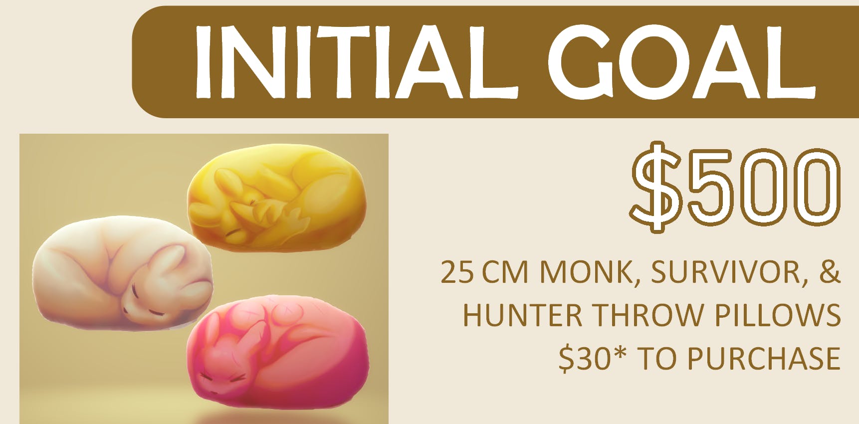 This campaign is intended to fund the manufacture of Rain World based 25cm (widest) throw pillows, at a base level depicting Monk, Survivor, and Hunter, with the others being funding achievements. Extras will be sold for $30, but if you fund this now, it'll be $16-20!