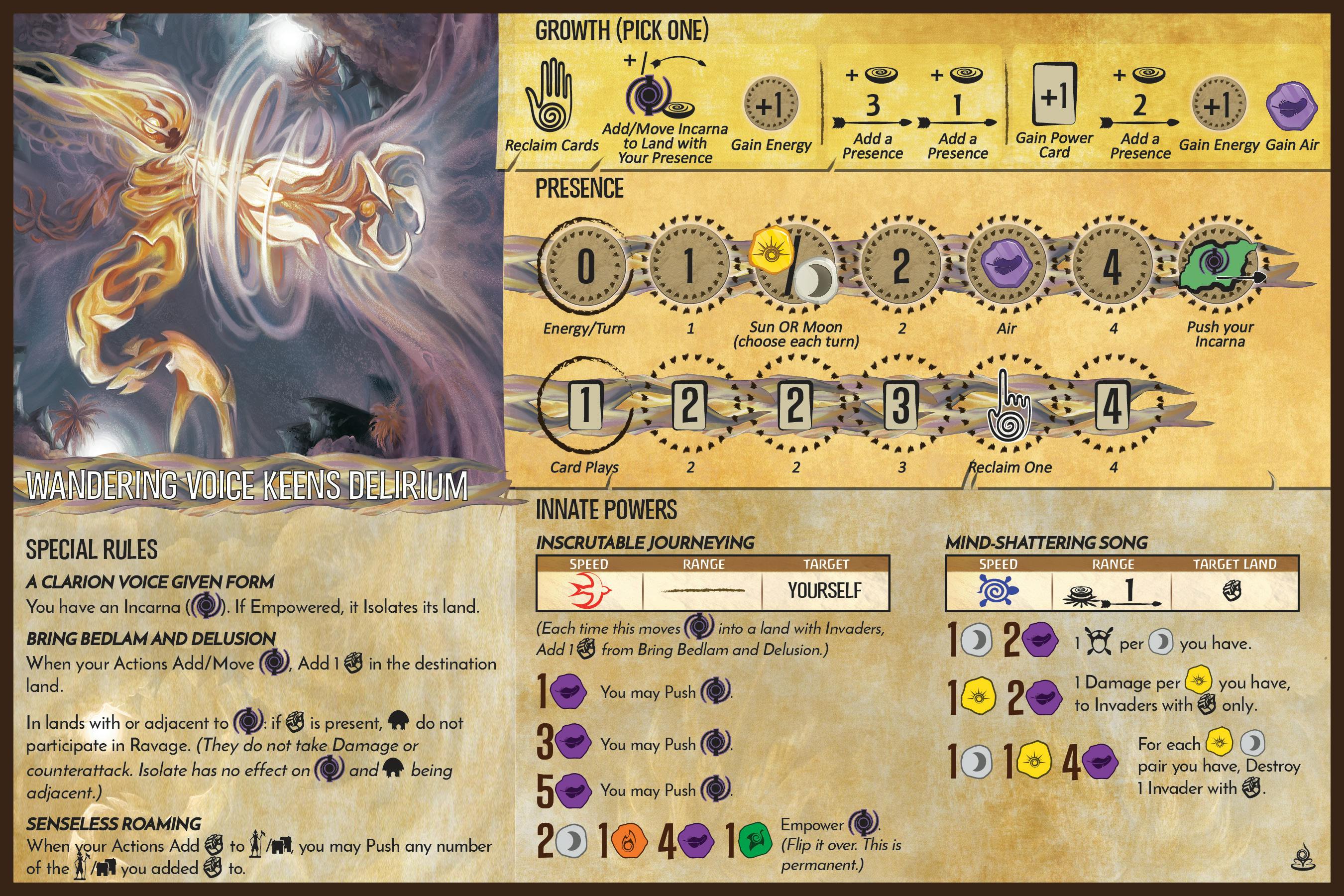 I designed Wandering Voice Keens Delirium right after Breath of Darkness Down Your Spine, as another Incarna Spirit. Some discussion on the Kindred Spirits podcast had highlighted that there were notably fewer control Spirits (counter Invaders by moving them) compared to direct-offense Spirits (counter Invaders by destroying them), and at the time this expansion was heavy on direct-offense Spirits, so “more control Spirits would be nice” was on my mind, and Ted had mentioned there was room for a High-complexity one. I couldn’t tell you exactly where the concept of a disembodied voice singing a mind-shattering song across the land came from, but once the idea got in my head it felt pretty compelling.