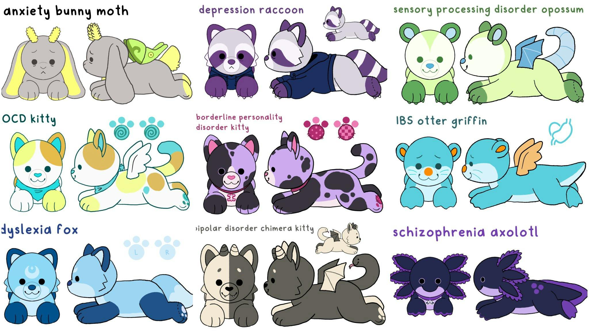 Tristan The Depression Raccoon: Tristan’s plushie will come with a removable hoodie accessory! He loves cozy video games like animal crossing and stardew valley. There are not many widely used symbols for depression that I could find, so I chose Tristan's colors based on how my depression makes me feel, bruised and cold.