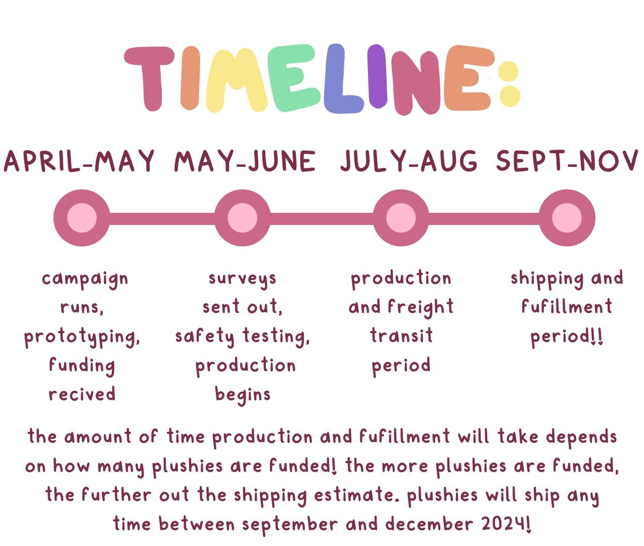 Plushie prototyping, production, and fulfillment takes quite a while! Sometimes from the start of the campaign to the end of fulfillment it can be up to ten months, but we will aim for sooner than that! I will keep everyone up to date on prototypes, fulfillment, and production as I receive updates myself!
