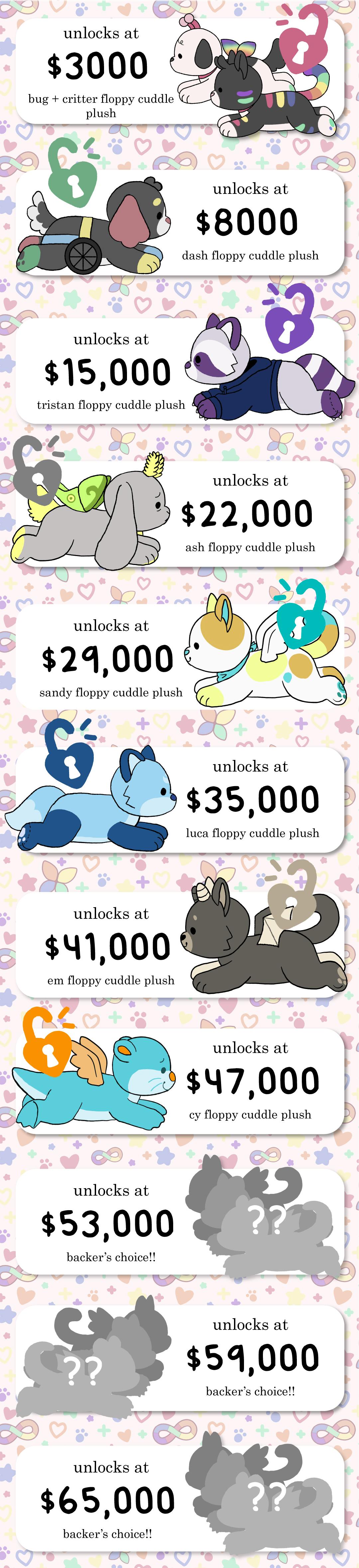 While I would love to make 5+ plushie designs at once of my own accord, unfortunately the cost is too high for me as a small business to afford outright, which is why I typically opt for crowdfunding when it comes to large scale projects! The way it will work is that as we continue to reach goals, we will unlock more plush designs as we go! Think of it sort of as both an investment and a preorder combined - you are helping fund production for the designs while also securing plushies for yourself!