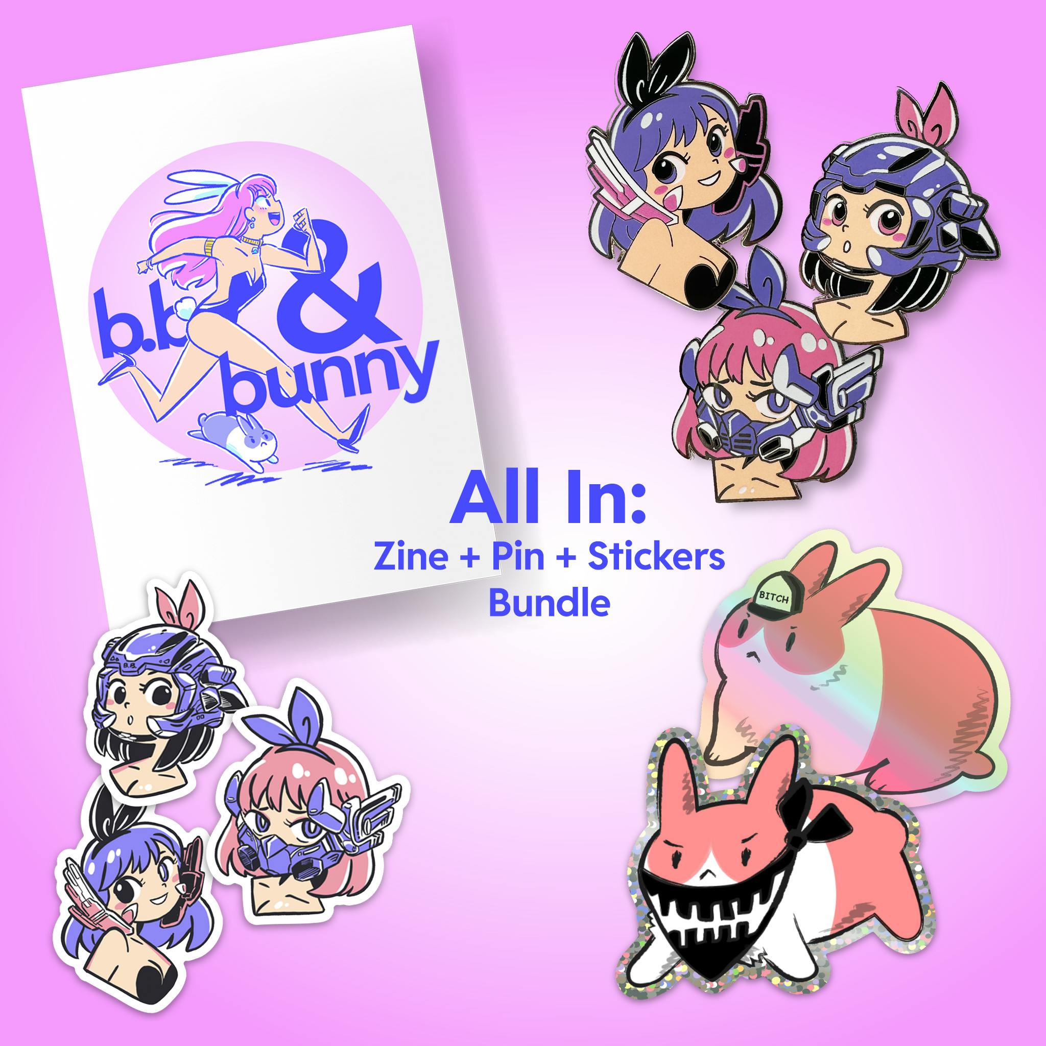 Publisher’s Zine + All Three 2" BB Hard Enamel Pins + All Three 2" BB Stickers + All Two Bunny 3” Holographic Stickers