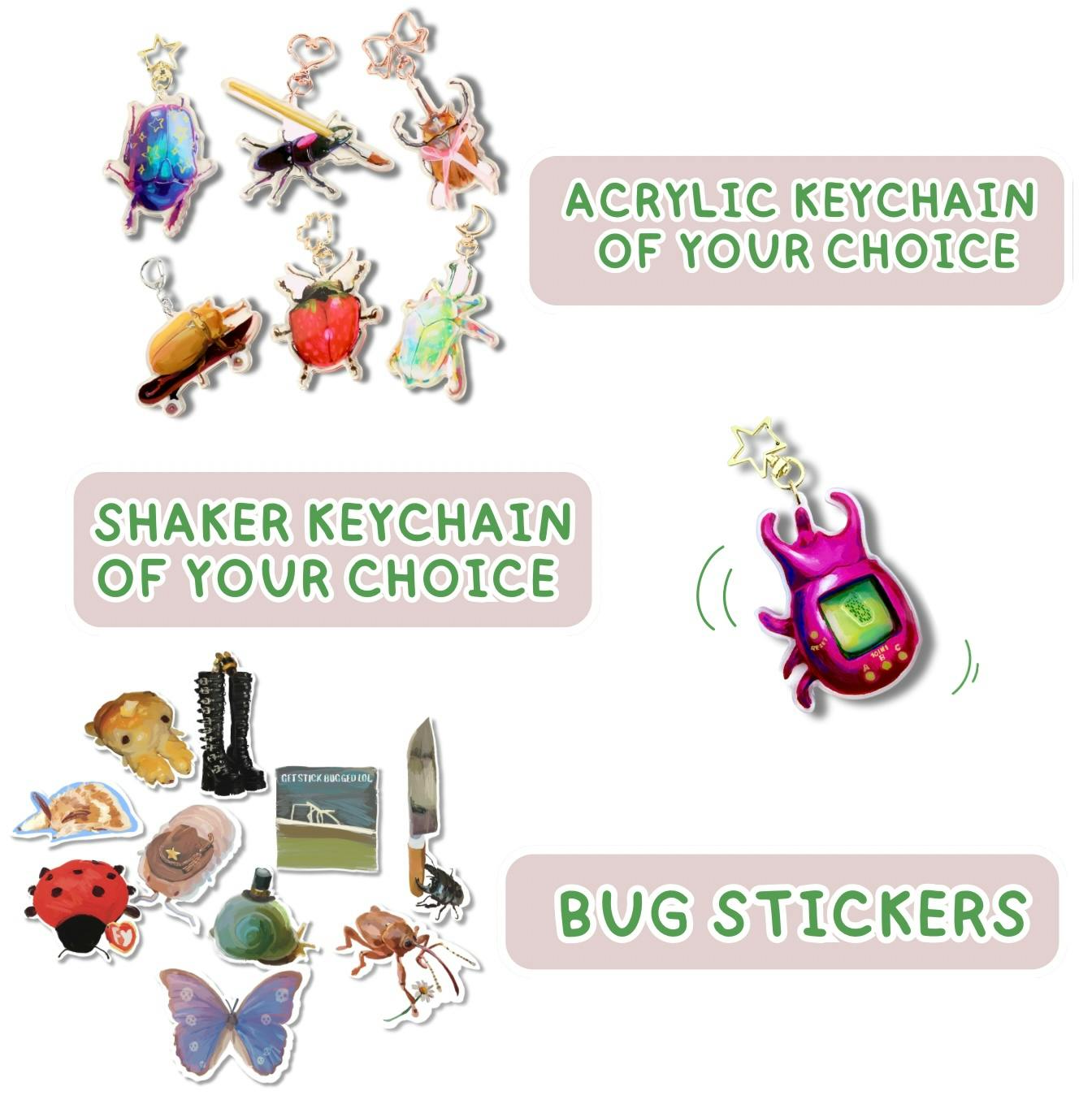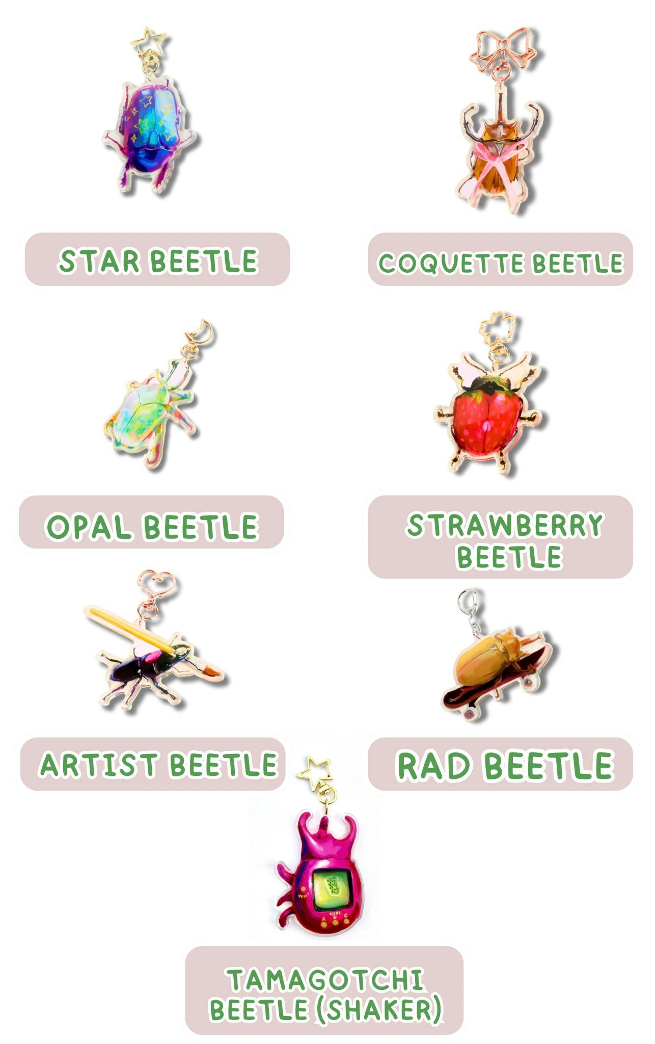 Here’s a list of all 7 beetle keychains! To get one, go to pledge levels, select “Bug Keychain of Your Choice”, (or "Shaker Bug Keychain of Your Choice") and you’ll be able to make your selection during the survey post-campaign!