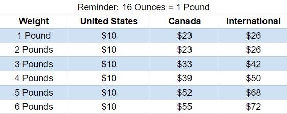 Here’s a general breakdown on how much you can expect to pay for shipping based on the weight of your pledge. I have added estimated weights and shipping costs to all ad-ons and pledge levels, so if you add those all up you should have a decent idea of how much shipping will cost.