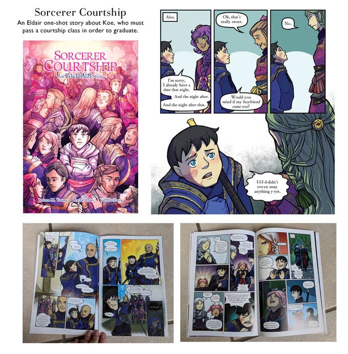 There are lots of amazing ad-ons for this campaign, including all the previous books as well as original custom art options! One amazing ad-on is the one-shot comic "Sorcerer Courtship," which is about the main character, Koe, trying to pass his courtship class.