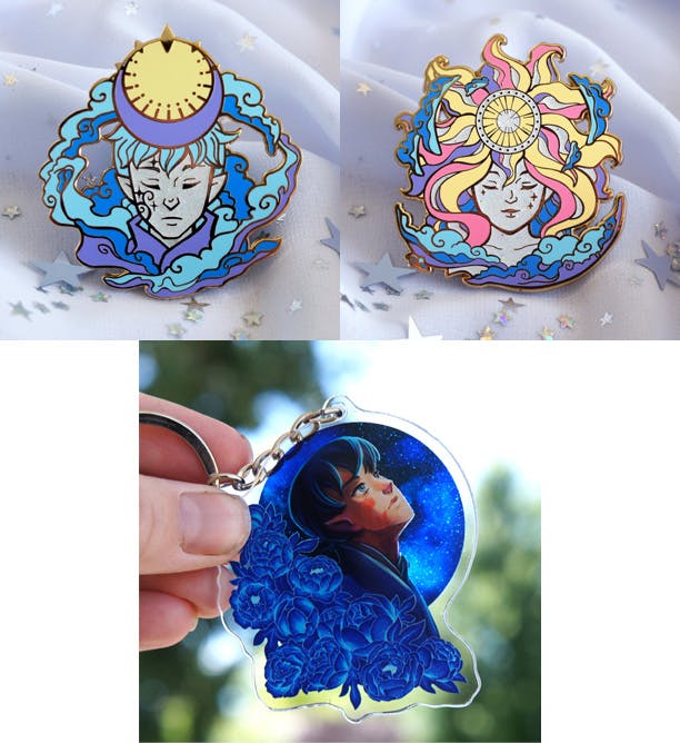 I also have some fun merch, including these two enamel pins of Embera as the sun and Koe as the moon. There is also a pretty double sided acrylic keychain available to add to your reward.