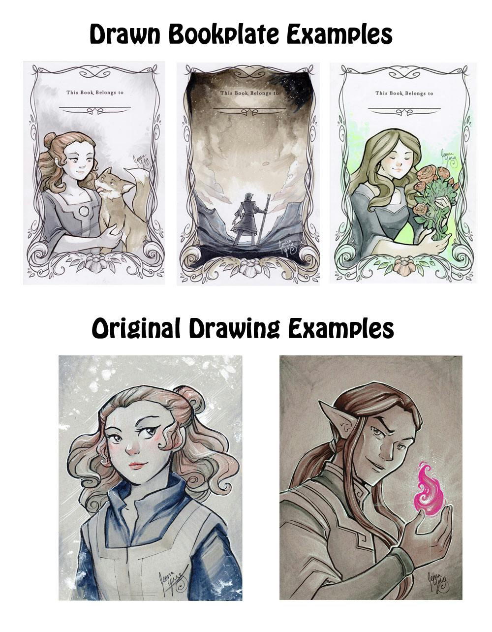 Examples of original drawings and custom bookplates.