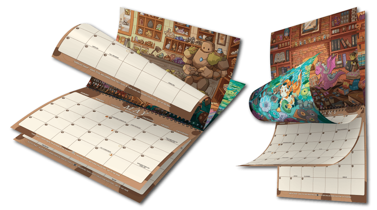 The cute stuff doesn't end with just this campaign! We are very excited to continue our collaboration together. Please be sure to check out the Collectors Guild Cafe website, where you can find links to our upcoming Webtoon comic, art process videos, and more based on characters found in this calendar.