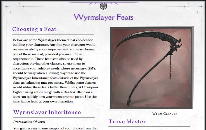 The Wyrmslayer (5E) - A full hyper mobile martial class themed around slaying dragons and utilising their power - 3 subclasses, roleplay and lore options, 2 lineages, 20 Wyrmslayer weapons and new feats.