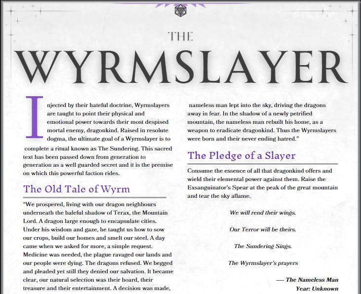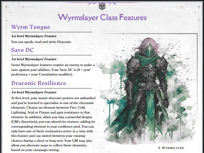 Ever wanted to play a cool dragon slayer who leaps into the sky, decimating giant monsters in the blink of an eye? Jump into the heavens and defeat dragons with style, with Power Word's first official class for 5E, The Wyrmslayer.