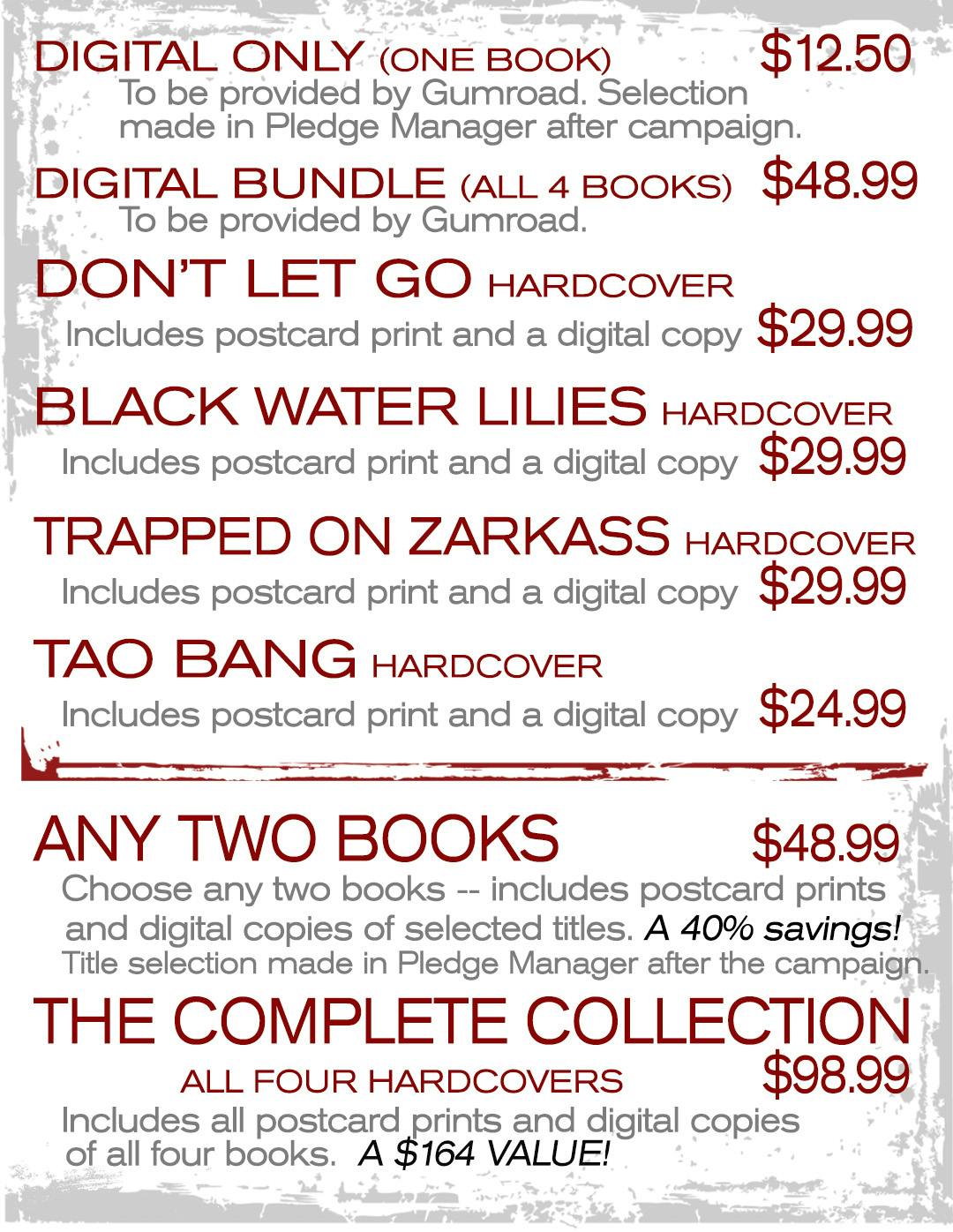 The target goal of this campaign is meant to cover the costs of the campaign exclusives being offered, such as the campaign-exclusive, limited-edition postcard prints. Books may be ordered individually or you can create your own customized bundle by selecting a specific title Pledge Level and then adding other titles as Add-ons. (Note: Add-on hardcovers do not include digital copies; those are tier-specific incentive bundles.)Â