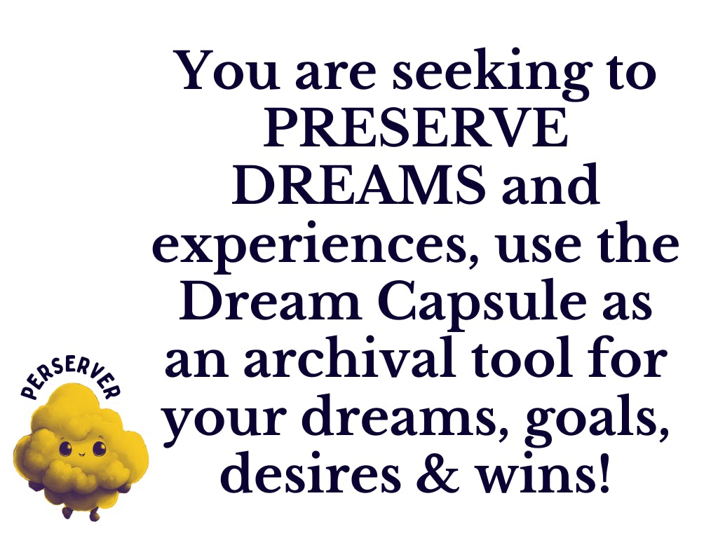 You are seeking to PRESERVE DREAMS and experiences, use the Dream Capsule as an archival tool for your dreams, goals, desires & wins!