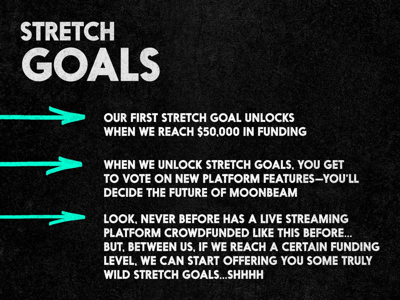 We have big plans for Moonbeam’s future! Our stretch goals are new platform features—we’re putting the future of Moonbeam in your hands! When we unlock a stretch goal, you’ll vote on what feature you want our team to implement. You can vote for features like short-form content features, video-on-demand capabilities, direct messaging, and more! We want Moonbeam to be your favorite platform—it should have the features you care about! We’re excited to see what direction you take Moonbeam in!