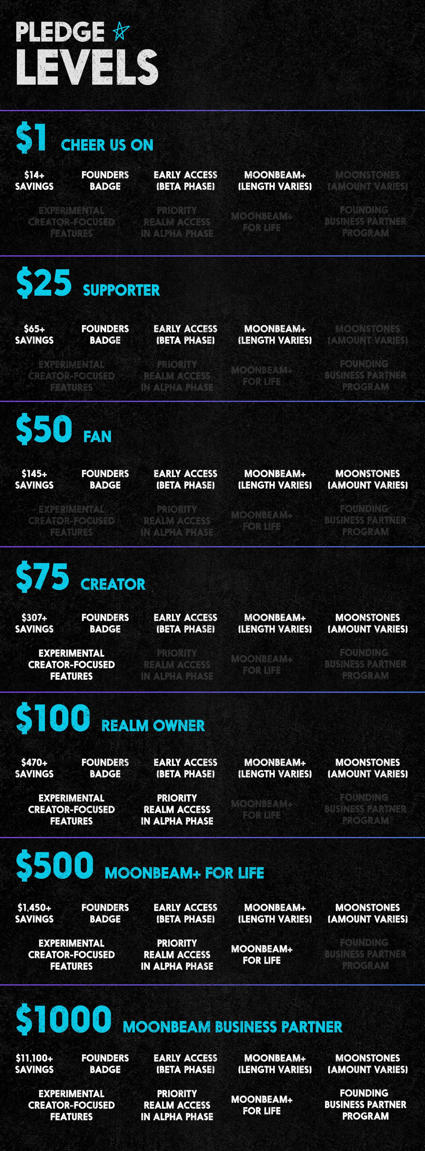This BackerKit campaign is the only time we’ll ever offer Moonbeam+ for life—you receive an exclusive Moonbeam Founders badge to display on your Moonbeam profile, early access to our alpha phase, 15,000 moonstones, Moonbeam+ benefits for LIFE, early access to experimental creator-focused features, and priority Realm access in alpha phase.