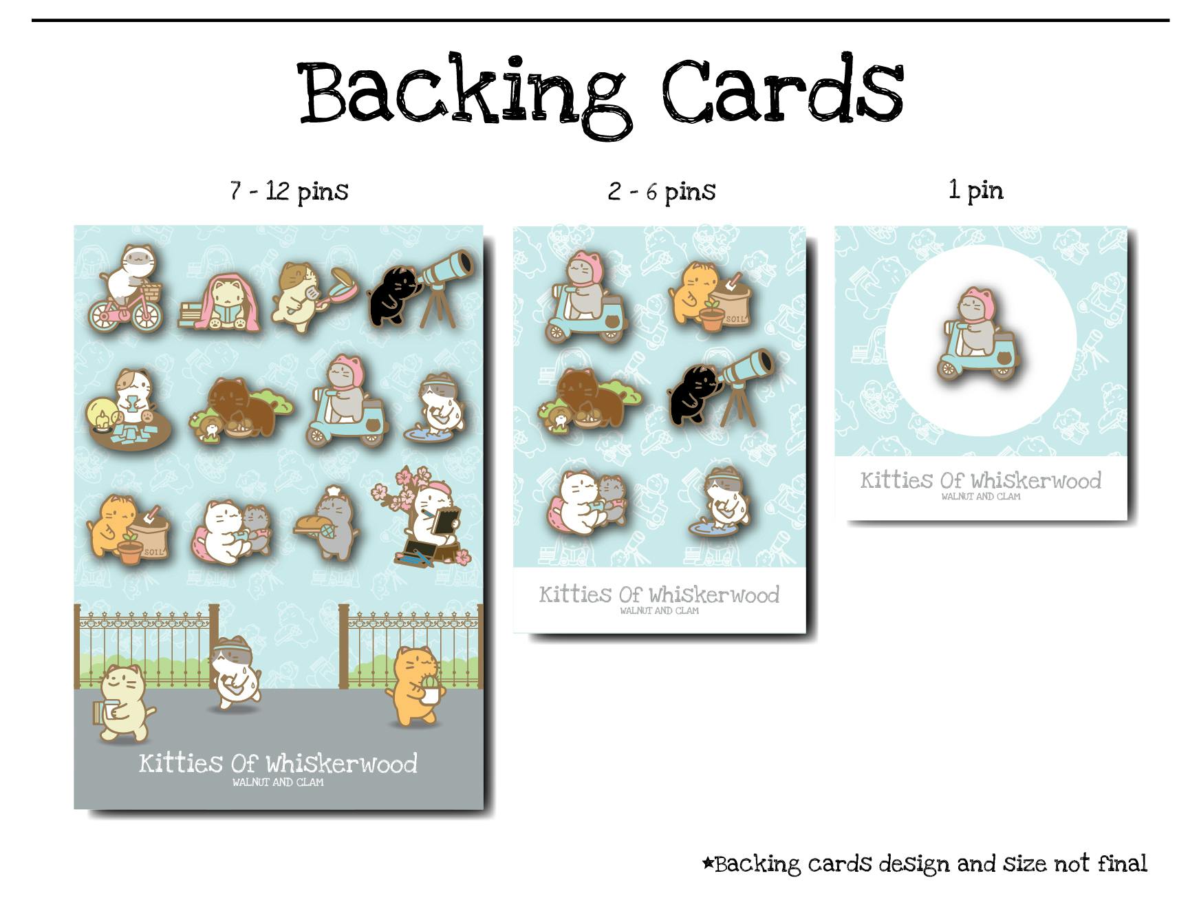 All pins will be shipped with backing cards. However, to save on material and time for fulfillment, the pins will be packed according to above plan. Please note that the designs and sizes of the above backing cards are not final.