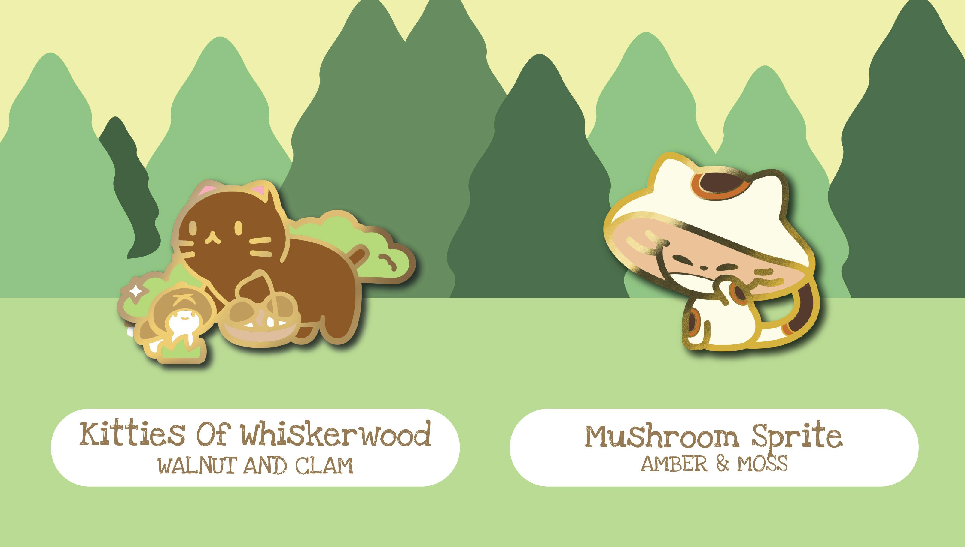 Before we dive into the designs, I am really excited to announce that Kitties of Whiskerwood is a Backerkit Pintopia 2 crowdfunding project! It is a special project in which I collaborate with another amazing artist, Amber & Moss (see link for their project), to bring you an exclusive crossover pin that will be offered to all backers as a freebie!! Here is how you can get this freebie pin:
