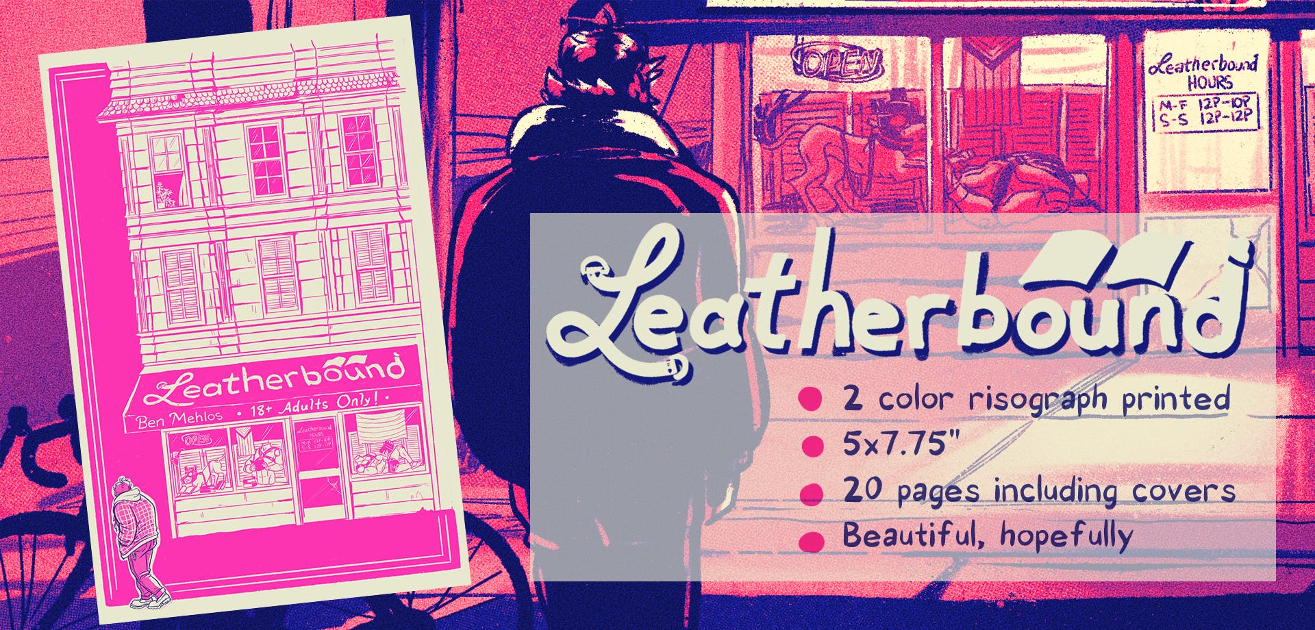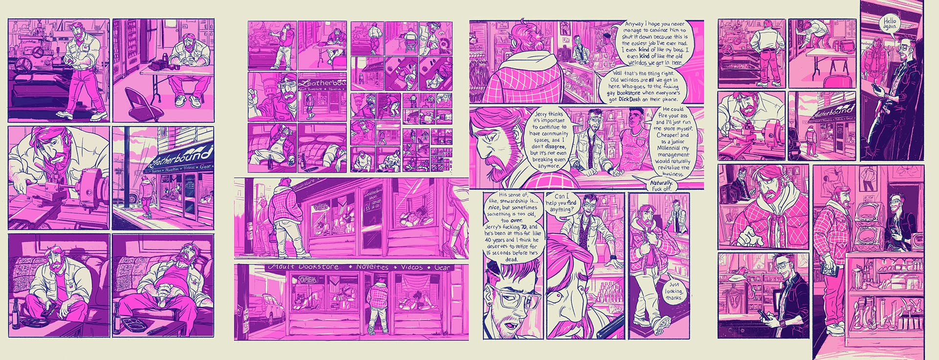 ... but Leatherbound is the star of this show. I recently became enamored with Risography, but unfortunately for my budget, so is everyone else. Originally devised as a low cost spot color alternative for businesses, Risograph printing's uniquely neon, soy-based inks and zinester cred has made it a darling of independent artists in the past decade, which has driven the demand, and therefore the cost up considerably. But I've made the acquaintence of a local Risograph shop in my area that I want to partner with on this, and I hope to make a lovely little artifact out of Leatherbound. The original digital comic was done in grayscale with no intention of this eventual output (the Filthy Figments version used a gradient map to give it its pink/blue twilight hues); if anything I thought I might do a black and white zine style run. But with 2-color Riso (Flourescent Pink and Federal Blue, if you're interested!) I think this version will look warmer and toothier than the web original, and I'm limiting it to 200 copies, only 100 of which I'm making available via this campaign (I need some to get out to the cons and the zinefests, like I said!)