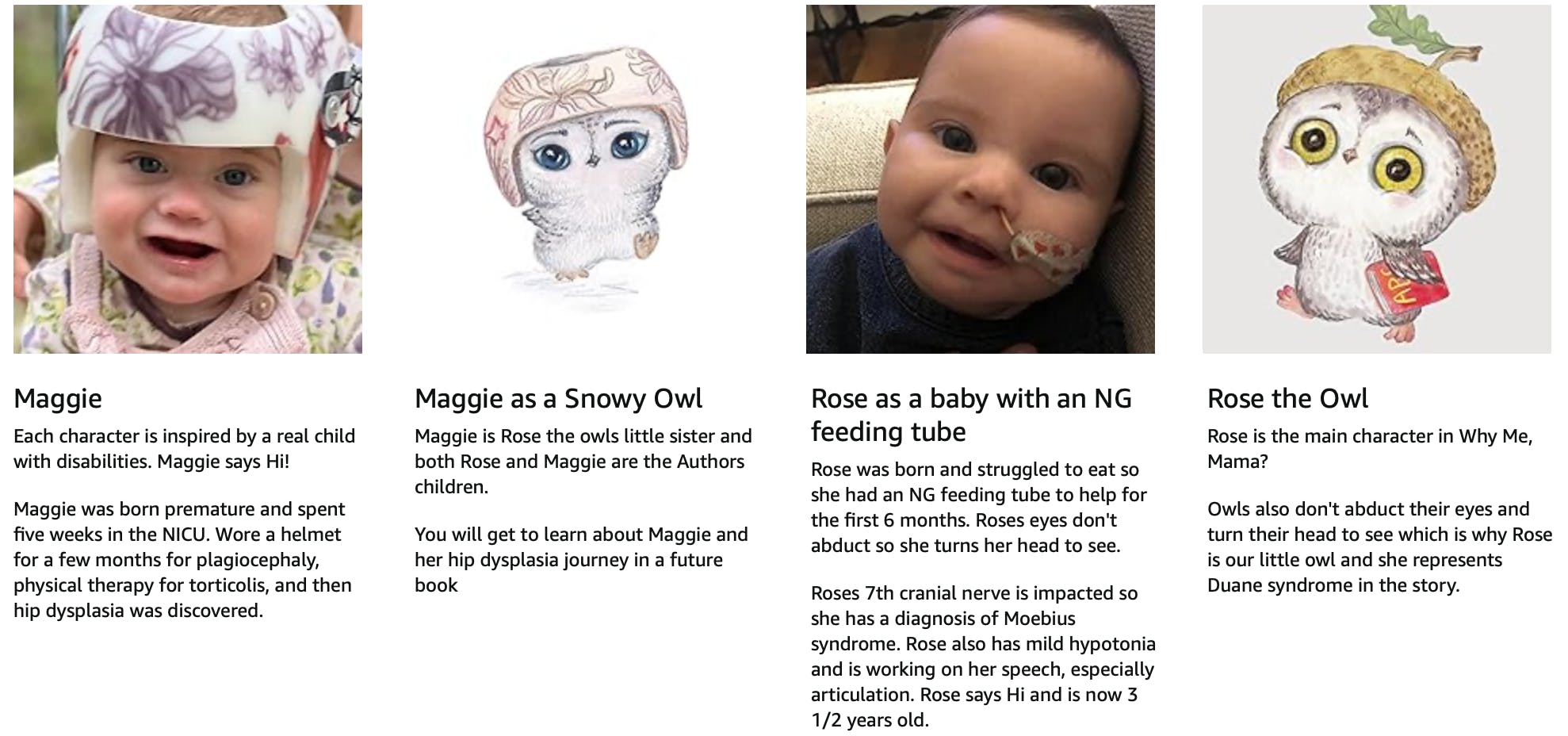 When our daughter Rose was born in July 2020, she wasn't able to eat and had a feeding tube for six months. We didn't know what was wrong so many specialists came to evaluate Rose and one noticed that she was unable to move her eyes laterally outward (like an Owl!). Rose received a diagnosis of Moebius Syndrome. When I wasn't able to find any representation of this rare condition - I wrote Why Me, Mama? a story about how everyone has something that makes them feel different - sometimes you see it and sometimes you don't & a bunch of wonderful Kickstarter backers raised the funds to bring it to life, helping to normalize disability as a part of everyday life, providing a foundation for acceptance and empathy for others and within themselves.