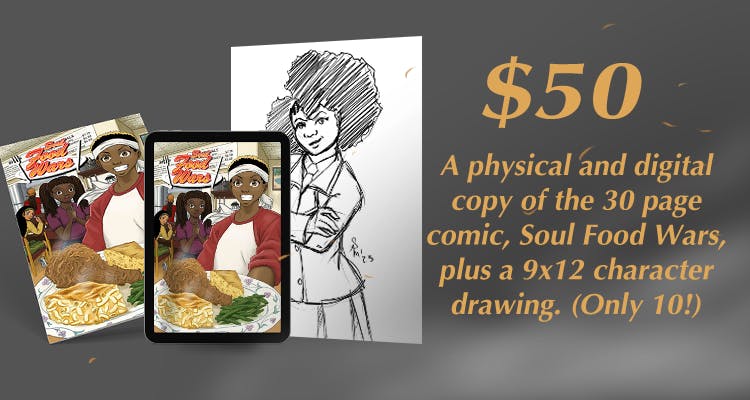 $50Â If you're generous enough to pledge fifty, you'll get the physical copy, the digital version, AND you'll get a 9" x 12" pencil drawing of a character, either one in the comic or my interpretation of other characters. I'm only offering ten of these so hop on it if you want one!