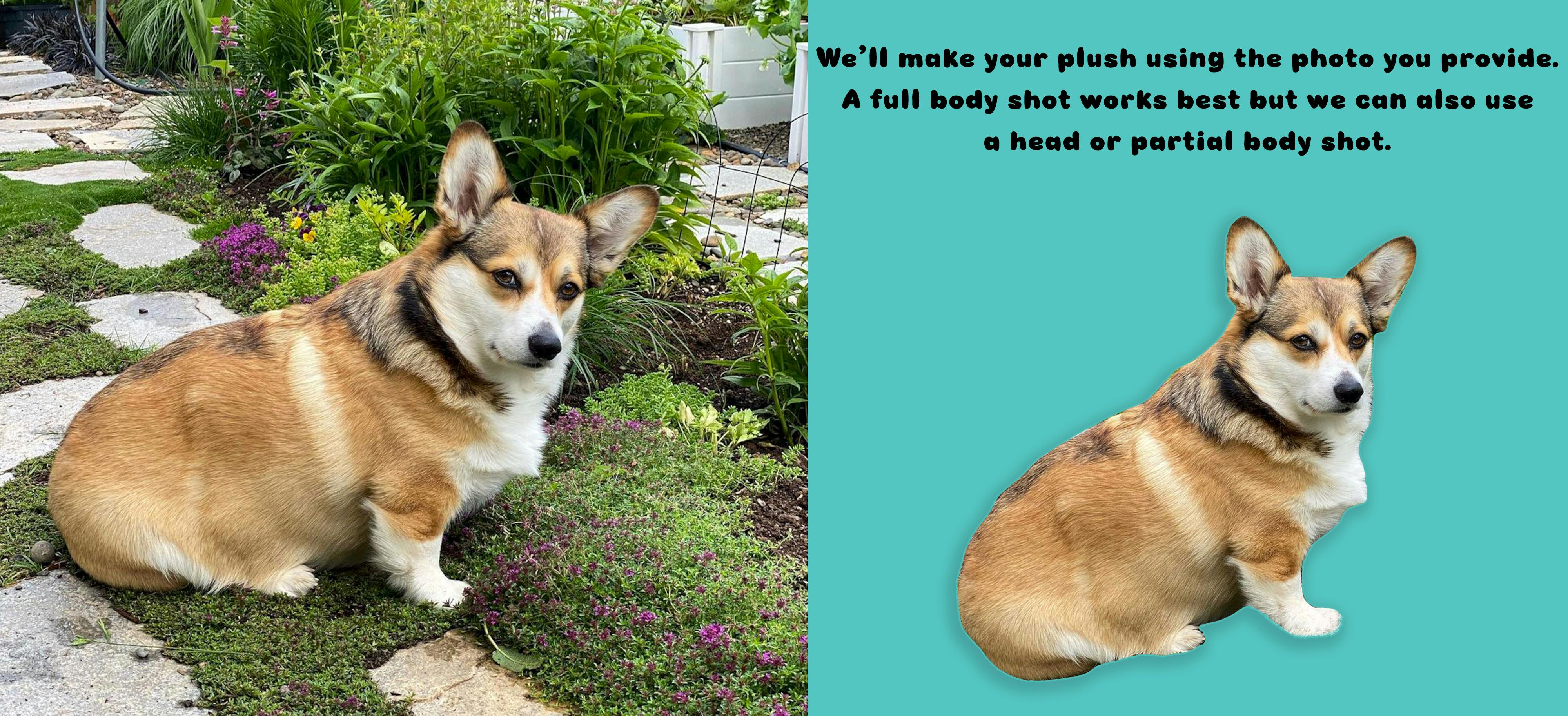 You provide a photo of your pet, we'll edit it, print it on Minky fabric, then make it into a stuffed plush!