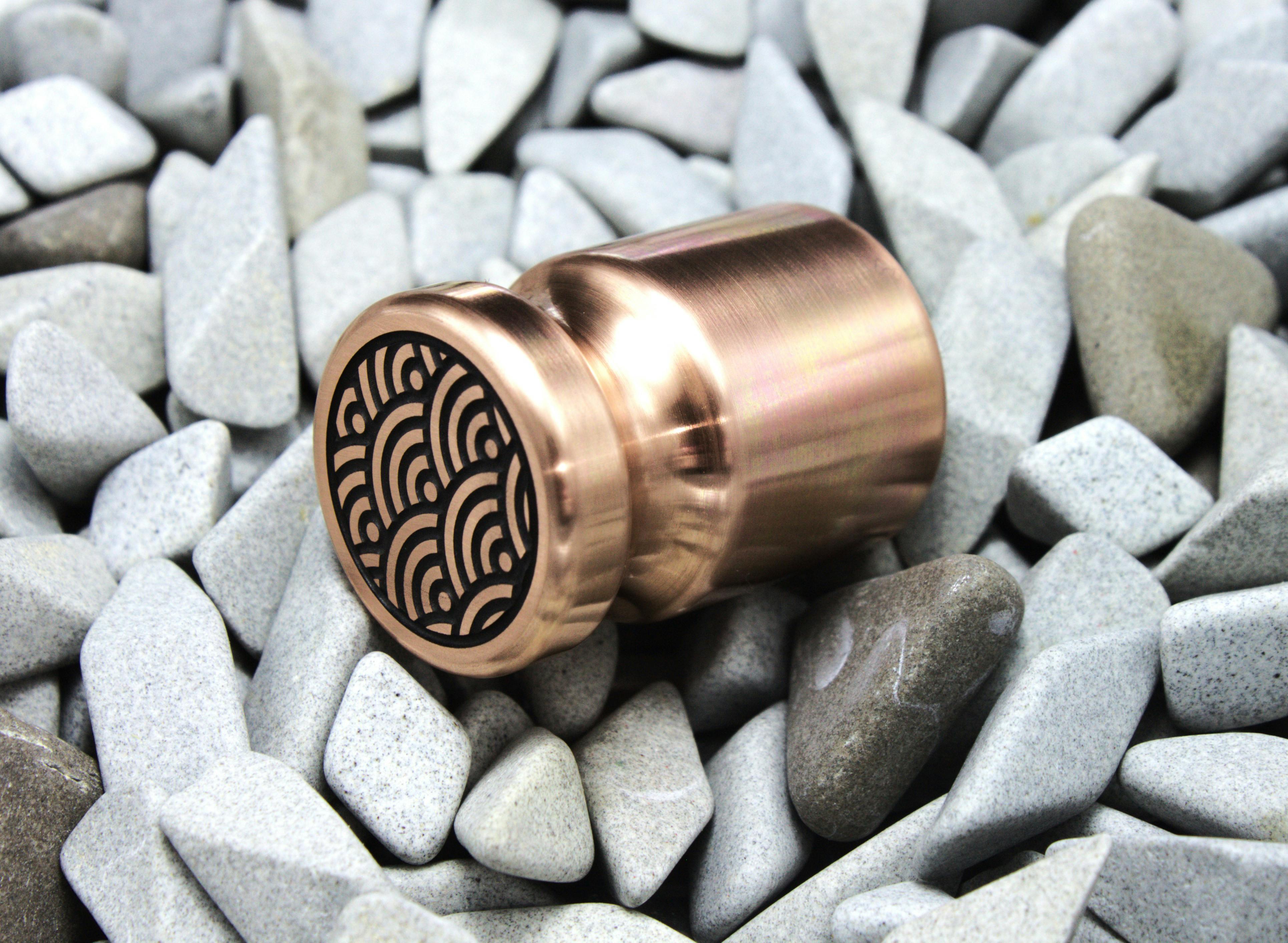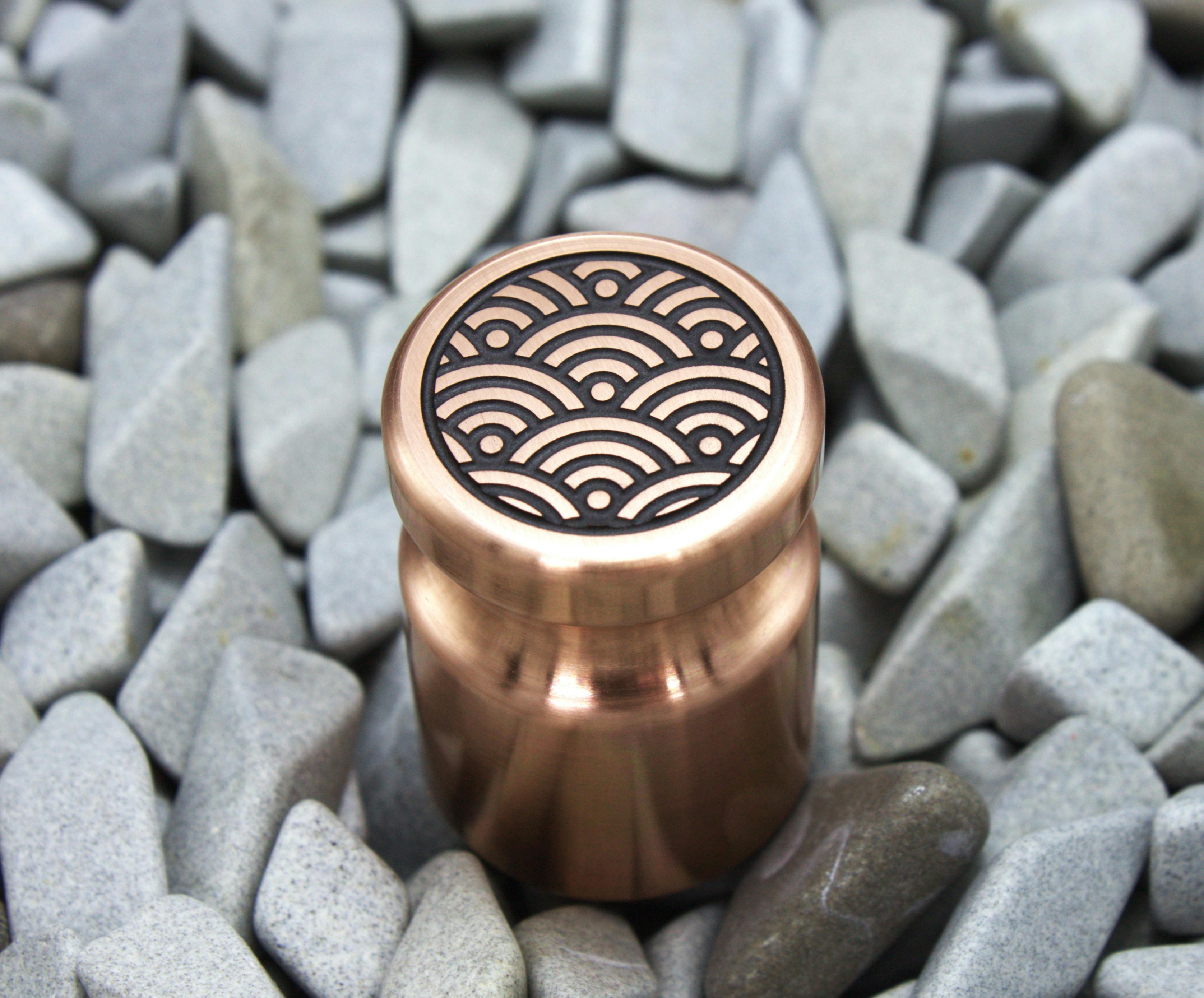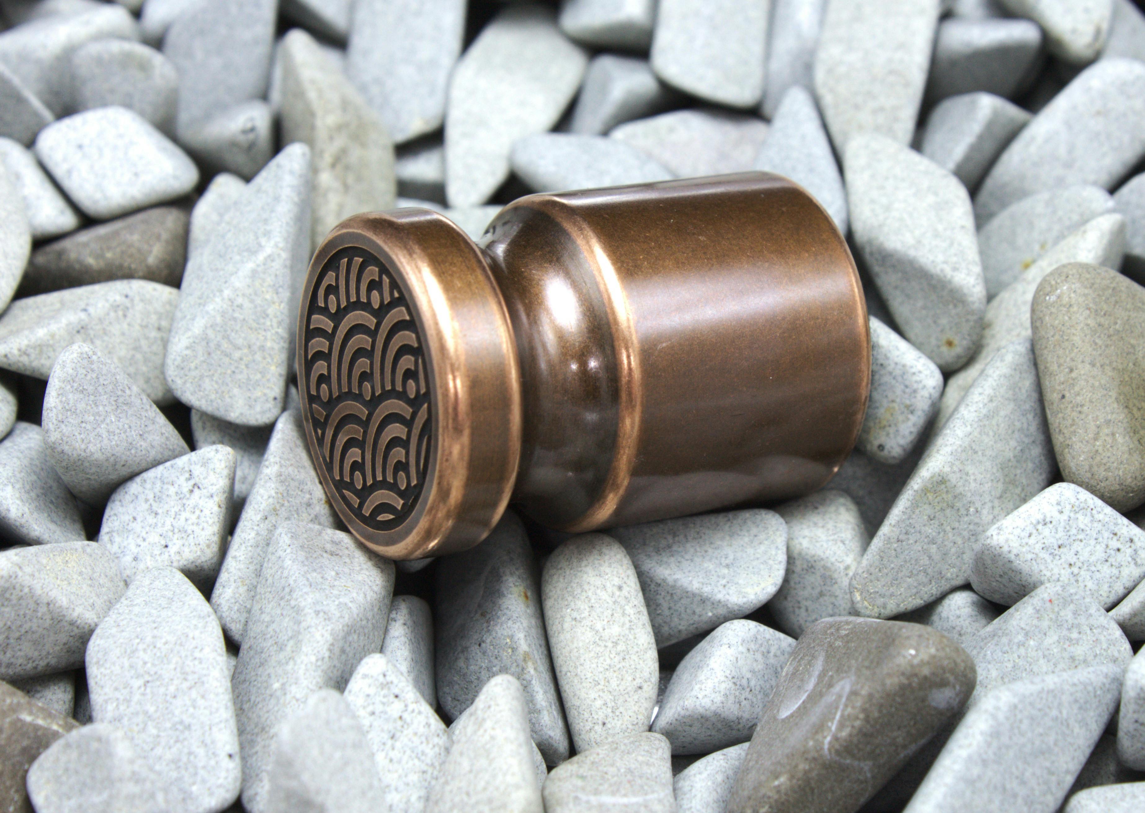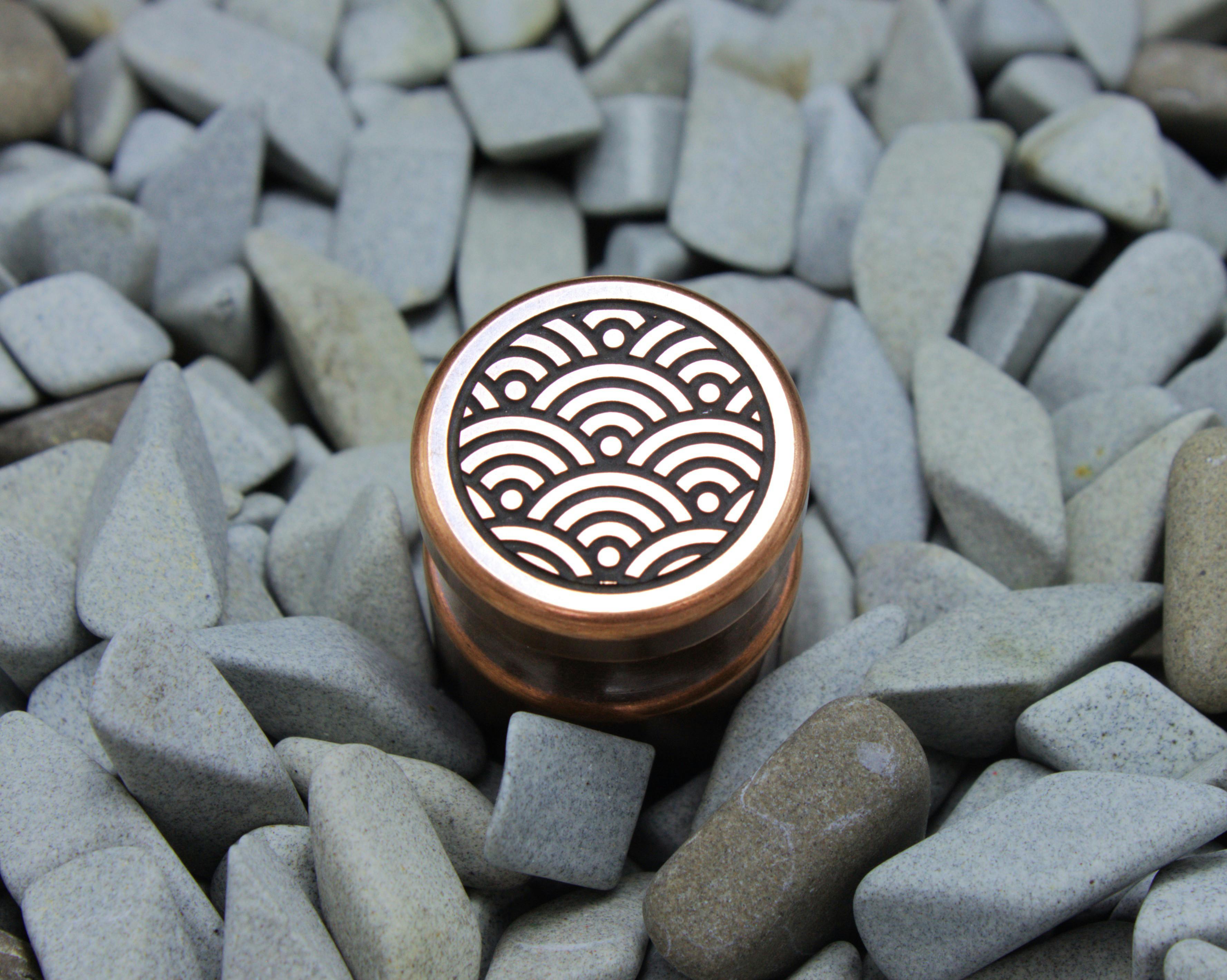 1" Diameter Copper Magnet Housings with a powerful bolted in magnet. Featured in two finishes, patina stone washed and satin sealed. Engraved on the top is the infamous aesthetic Seigaiha Pattern, Japanese Sea and Waves.
