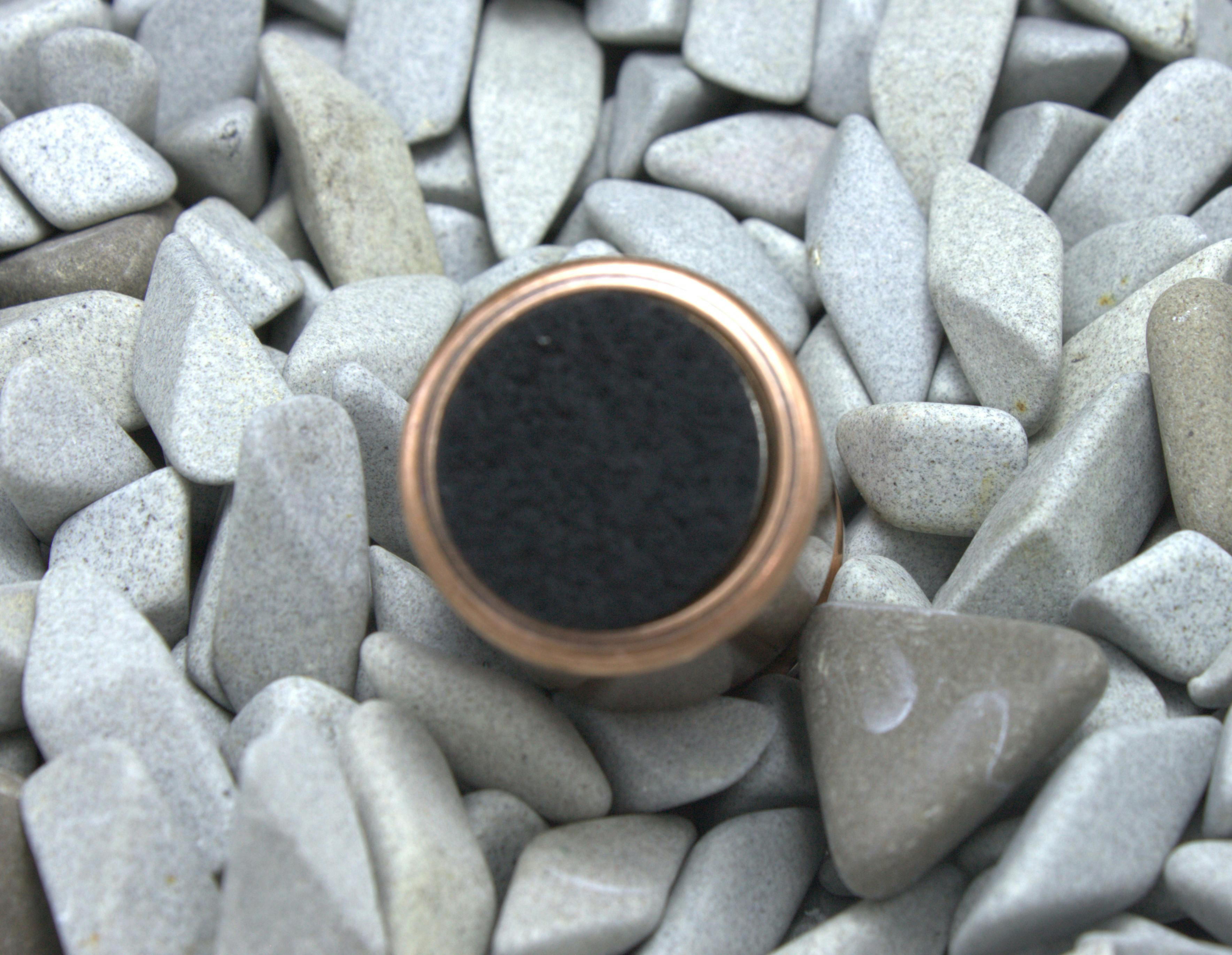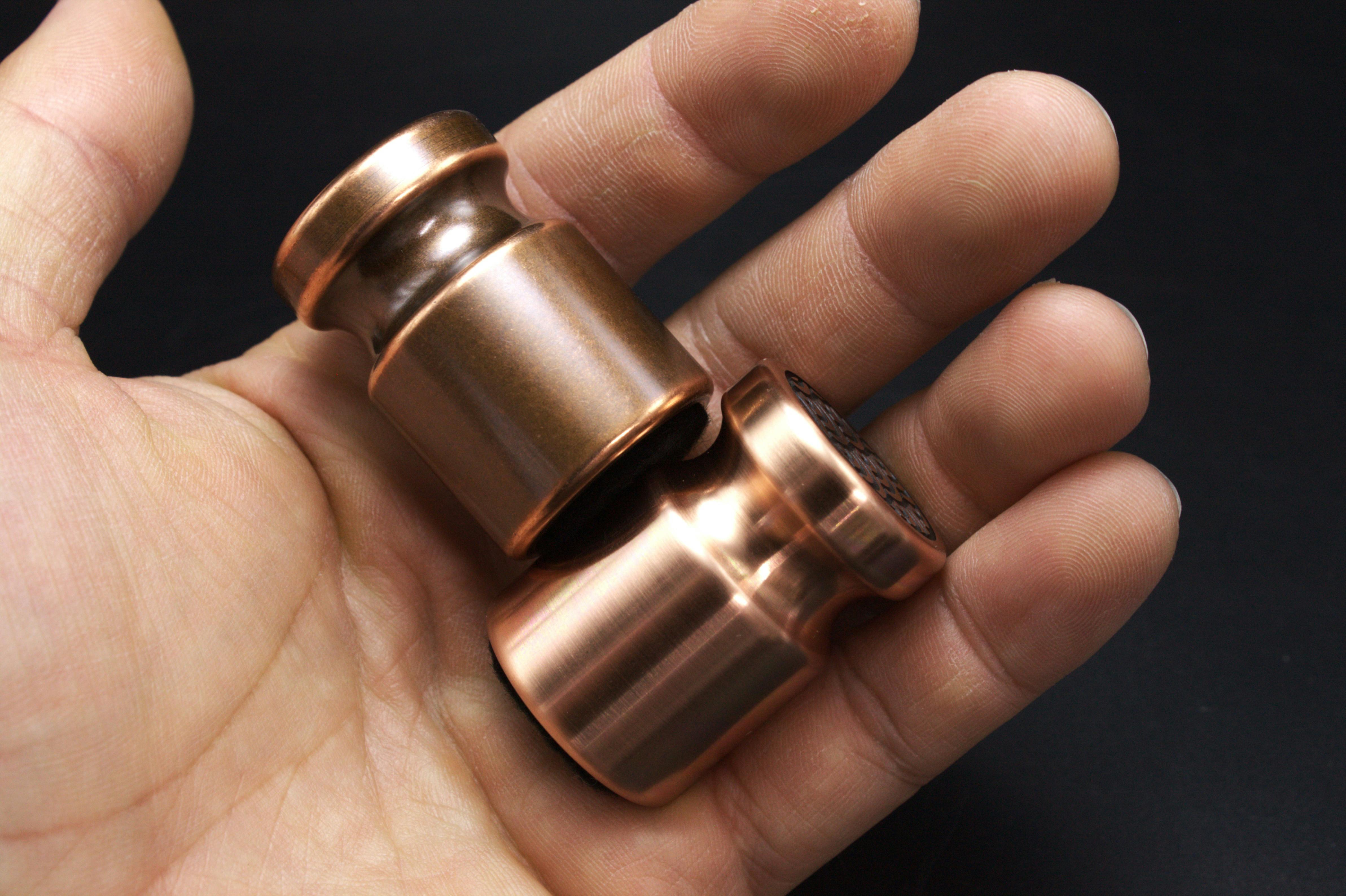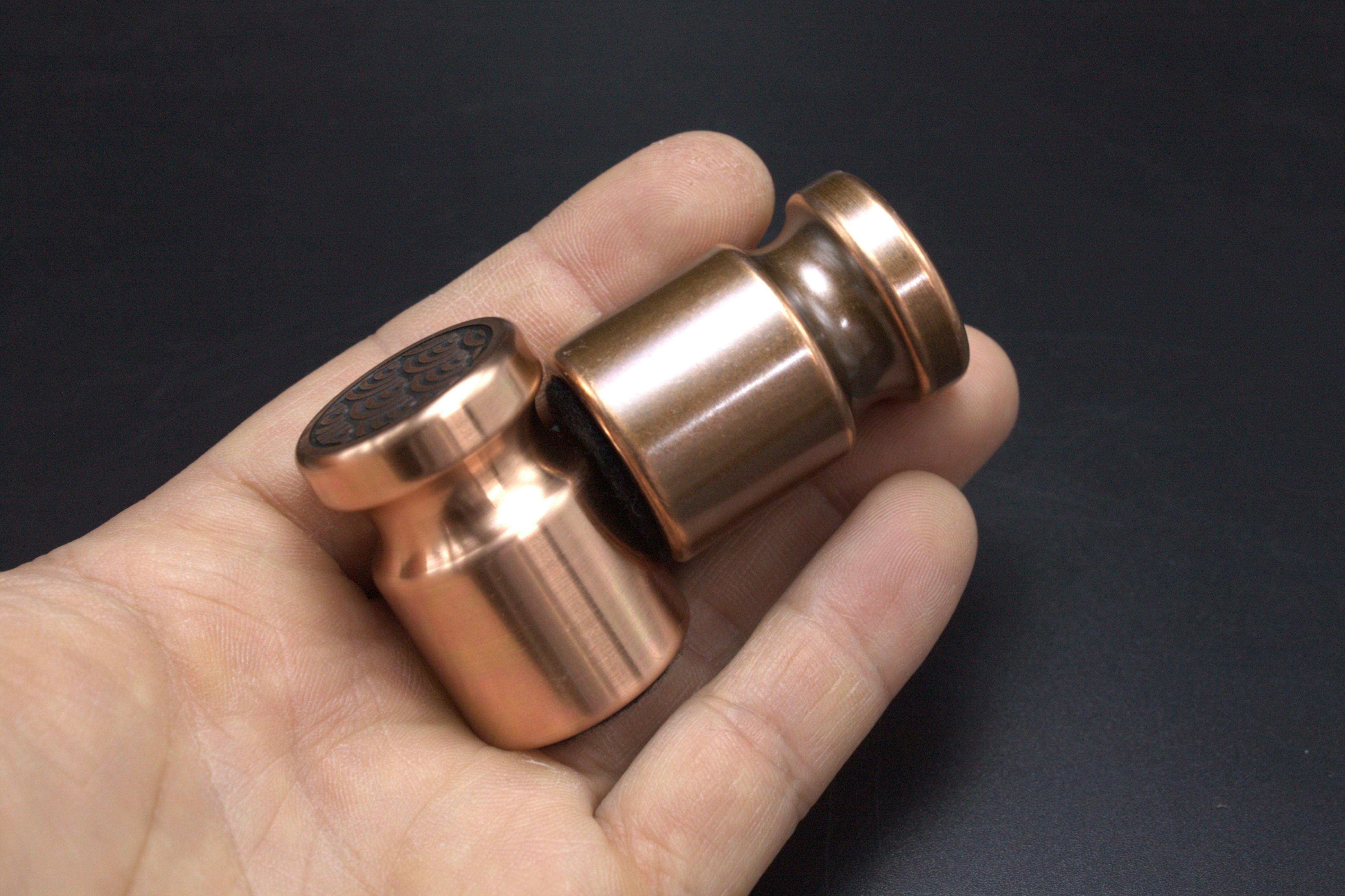 These are 1" diameter CNC machined copper magnets housings that have a rare earth magnet bolted in from the bottom. A felt pad covers the magnet to help dampen the impact on the attracted surface. Engraved on top is a Seigaiha pattern which is blasted for a matte finish and blackened with an acid wash. Two finishes are offered in this project, patina with stone wash or satin sealed.
