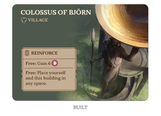 The Colossus is a sight to behold. When Heroes reinforce there, they may move the colossus to any space in the Four Kingdoms, taking themselves along. The warriors of the Kingdom are inspired by the Colossus and flock to the Heroes in that kingdom, bringing powerful blessings along with them.
