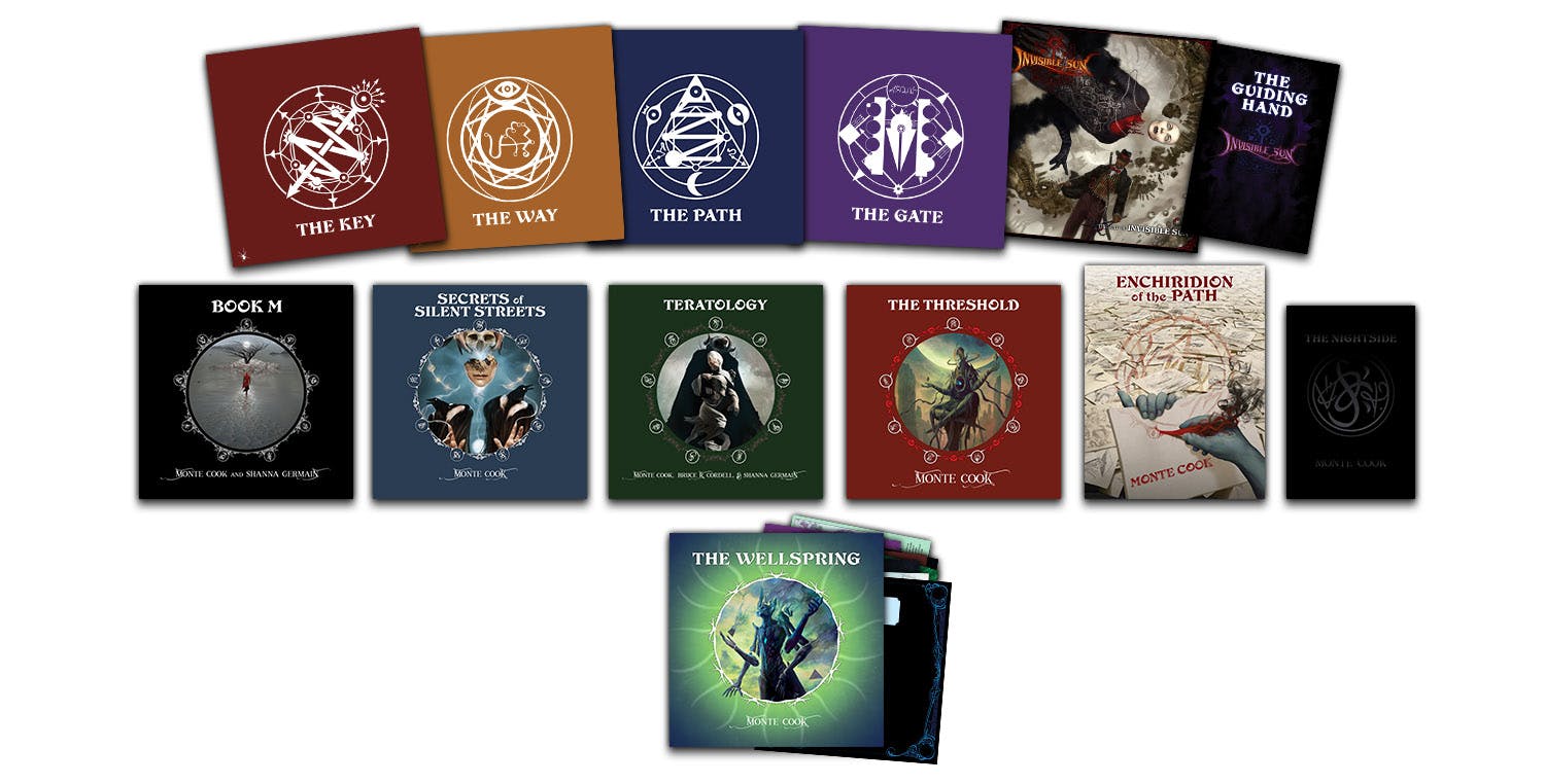 I shall have it all, but I disdain physical artifacts in favor of access through the Noösphere. I summon and engage the infamous Black Cube from the void. I receive one copy of the Invisible Sun game, plus the six existing supplements (Book M; Enchiridion of the Path; The Nightside; Secrets of Silent Streets; Teratology; and The Threshold). Although Invisible Sun is a breathtaking physical production, and, in their print versions, many of these titles include fascinating physical components, I receive each title in PDF only.