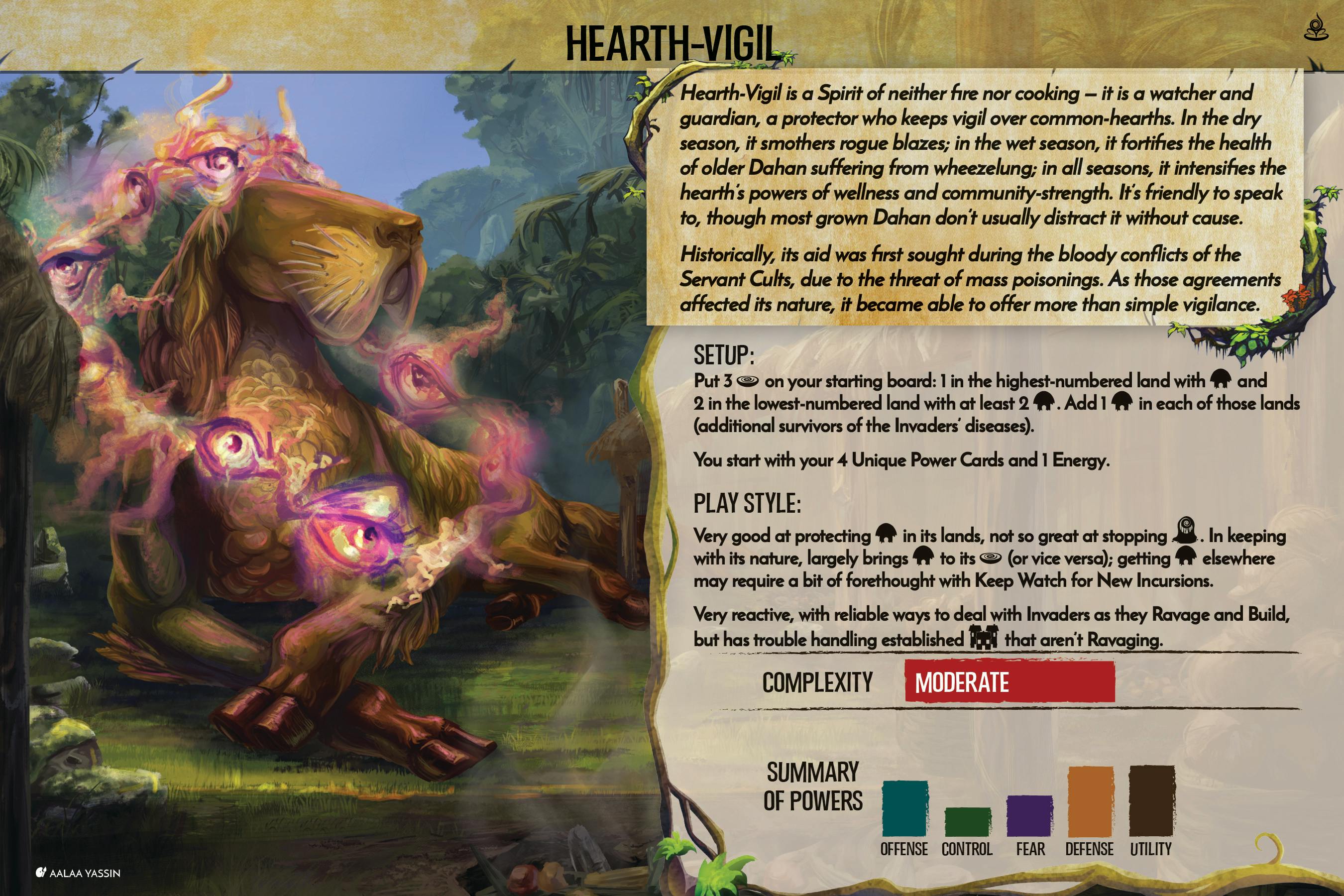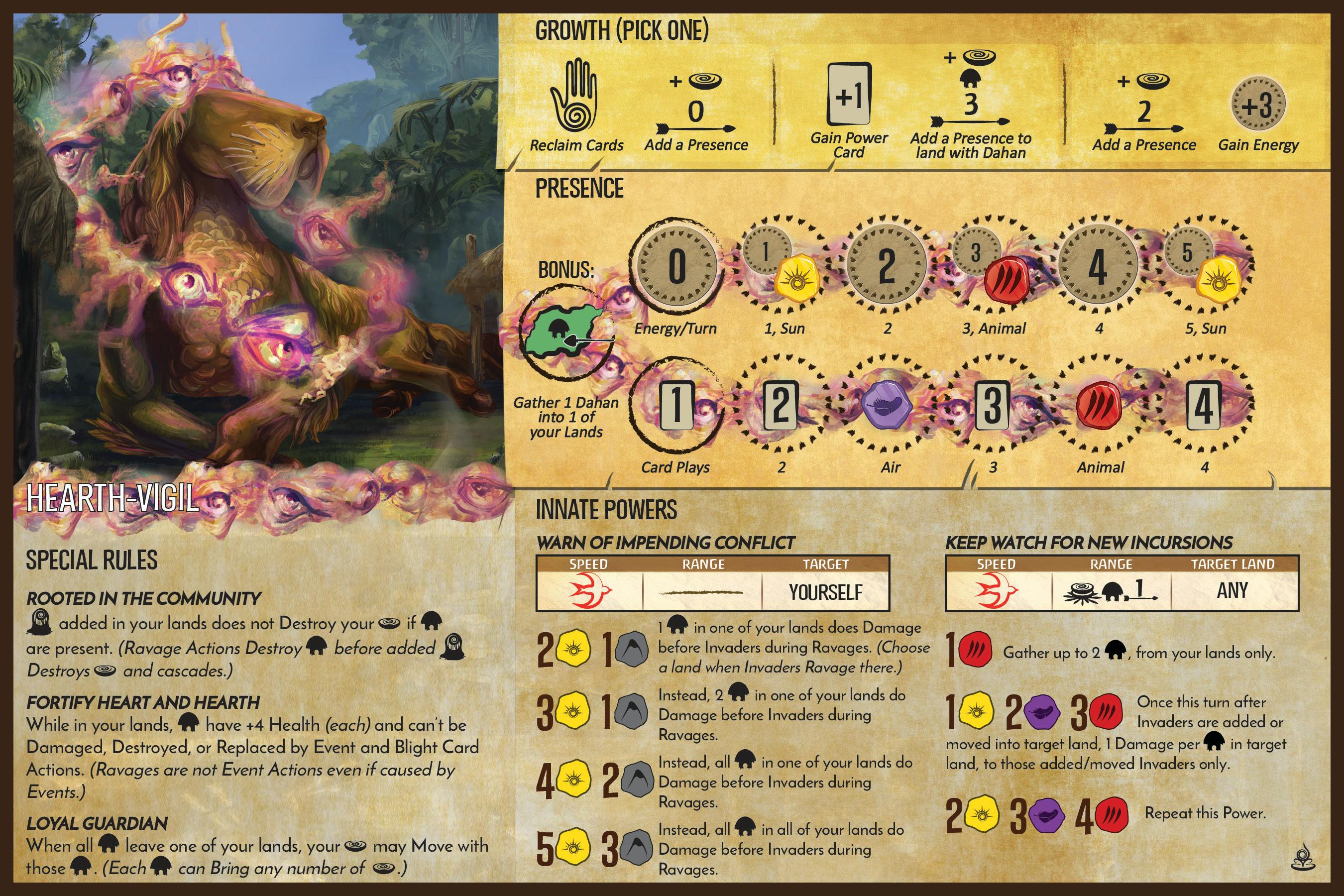Both of these Innate Powers reflect the thematic fact that while Hearth-Vigil is very attentive and alert, that it’s fundamentally a somewhat reactive Spirit. With such reactive Innates, Hearth-Vigil has to rely on Power Cards if it wants to be proactive. A couple of its Unique Powers do give it a bit of damage & Invader control, but it’s likely to be keeping an eye (or several eyes) out for more.