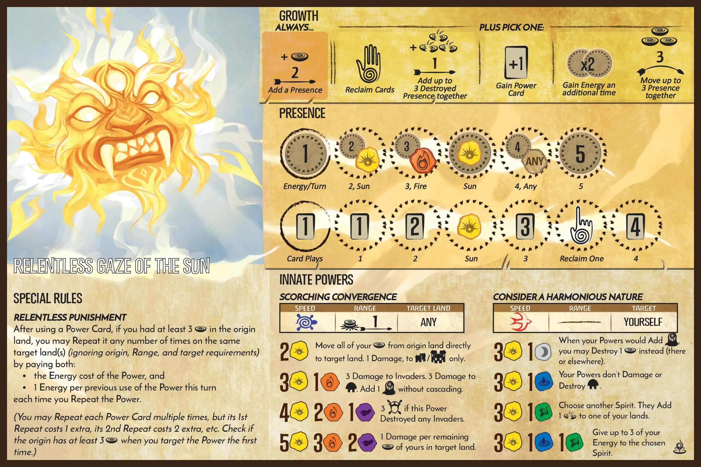 There are many Spirits of the sun and sun's light - some are gently beautiful, some are nourishing, some are aloof and barely touch the island at all. Relentless Gaze of the Sun is none of these things: it is a blazingly imperious Spirit that blasts the land with relentless heat. The tropical sun is something to respect and even fear.