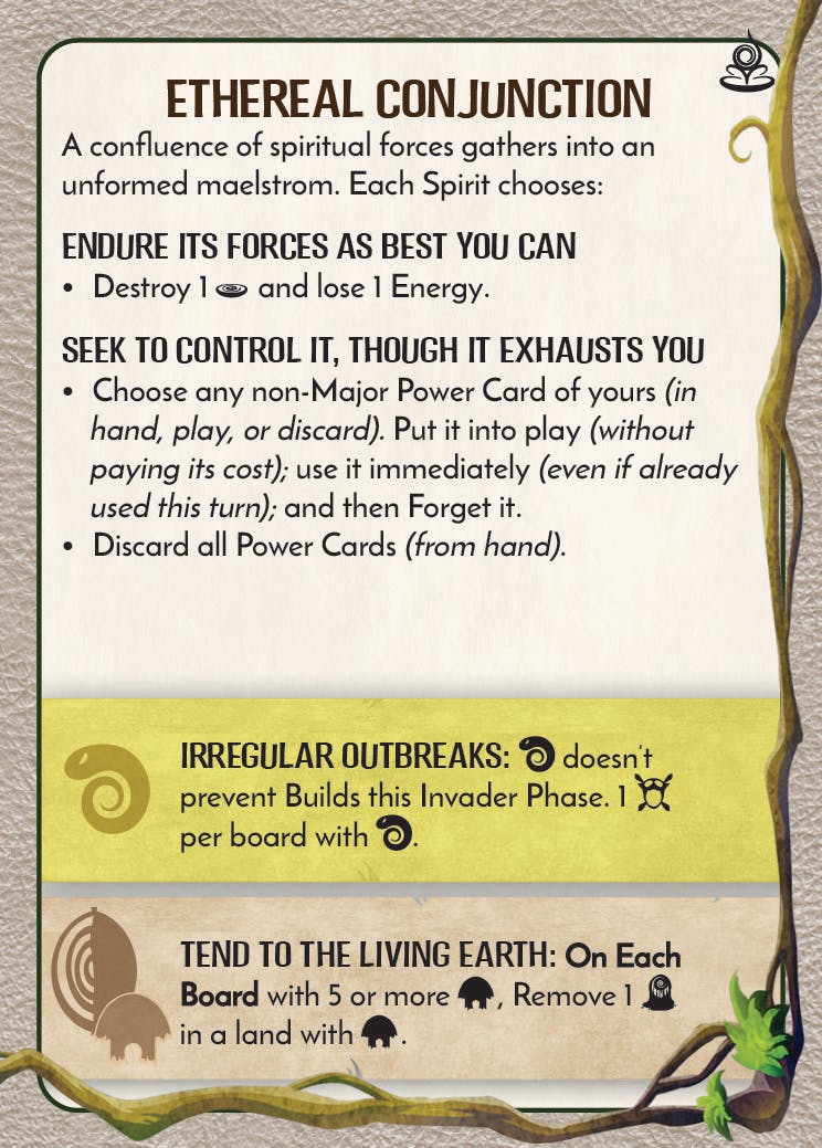 Here, each Spirit has a choice between paying a small cost to weather the storm and paying a higher cost to seize the initiative. Choosing which Power Card (if any) to use and lose can be a surprisingly hard decision – stronger effects help you more this turn, but hurt more to miss out on for the rest of the game.