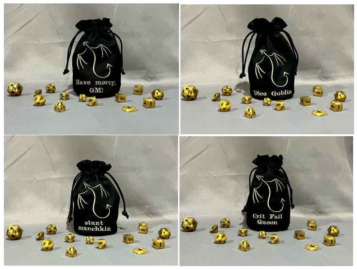 The soft twill, velour lined, dice bag has the Dragon Logo embroidered in gold metallic thread. Each bag may come personalized up to 15 characters. [Our supplier reserves the right to refuse requests for derogatory language or slurs of any kind, but adds they're just fine with George Carlin's "Seven Words."]