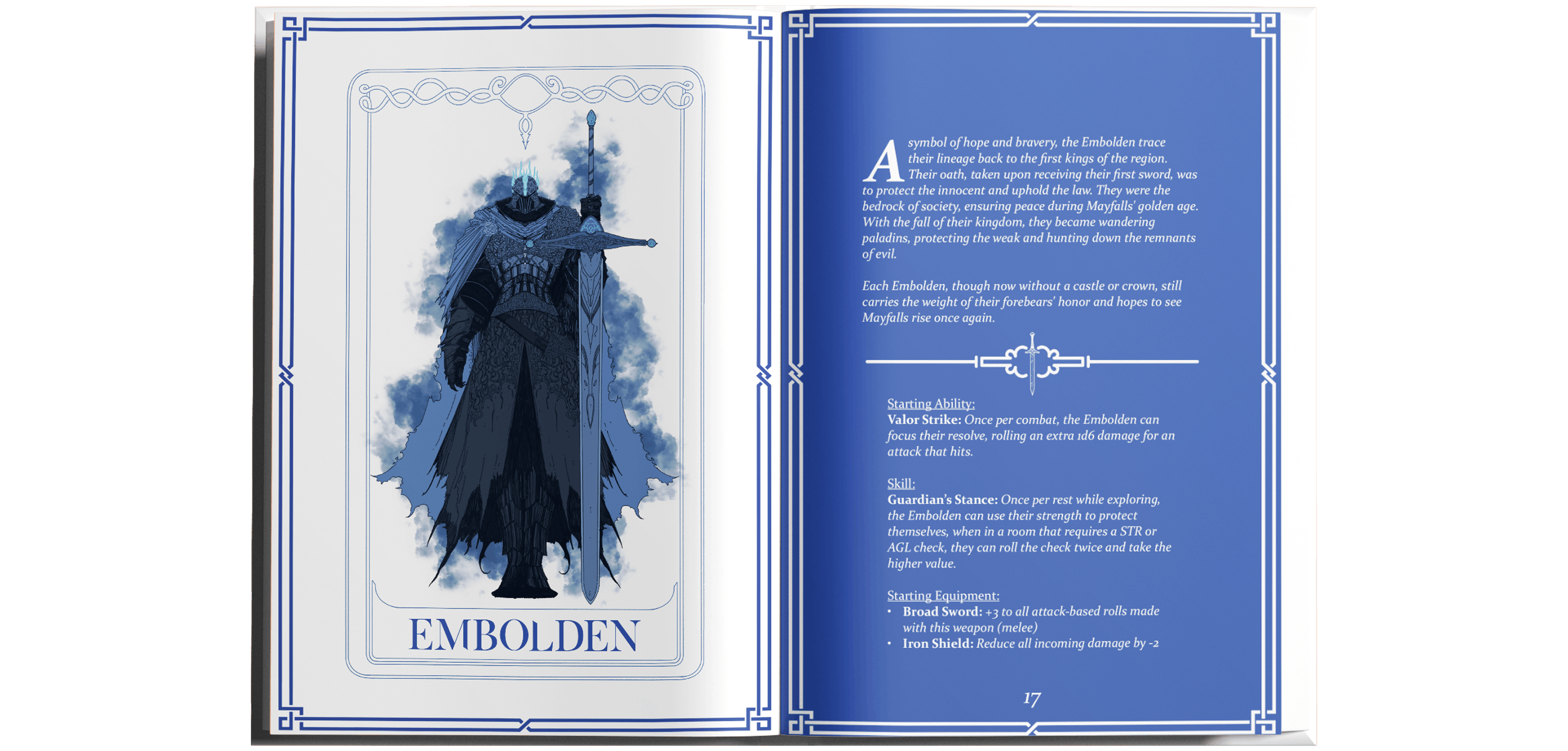 The Embolden - A symbol of hope and bravery, the Embolden trace their lineage back to the first kings of the region. Their oath, taken upon receiving their first sword, was to protect the innocent and uphold the law.