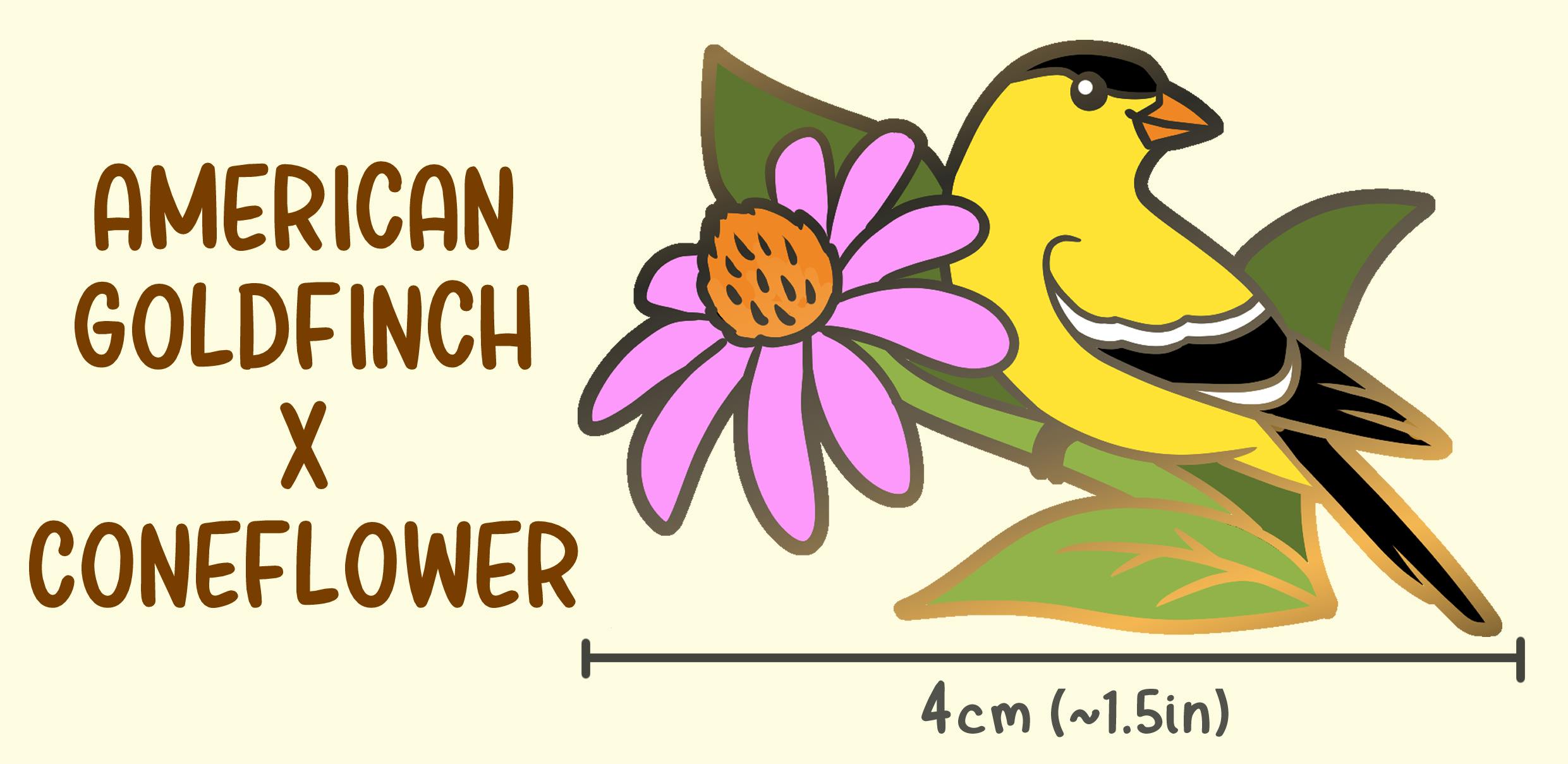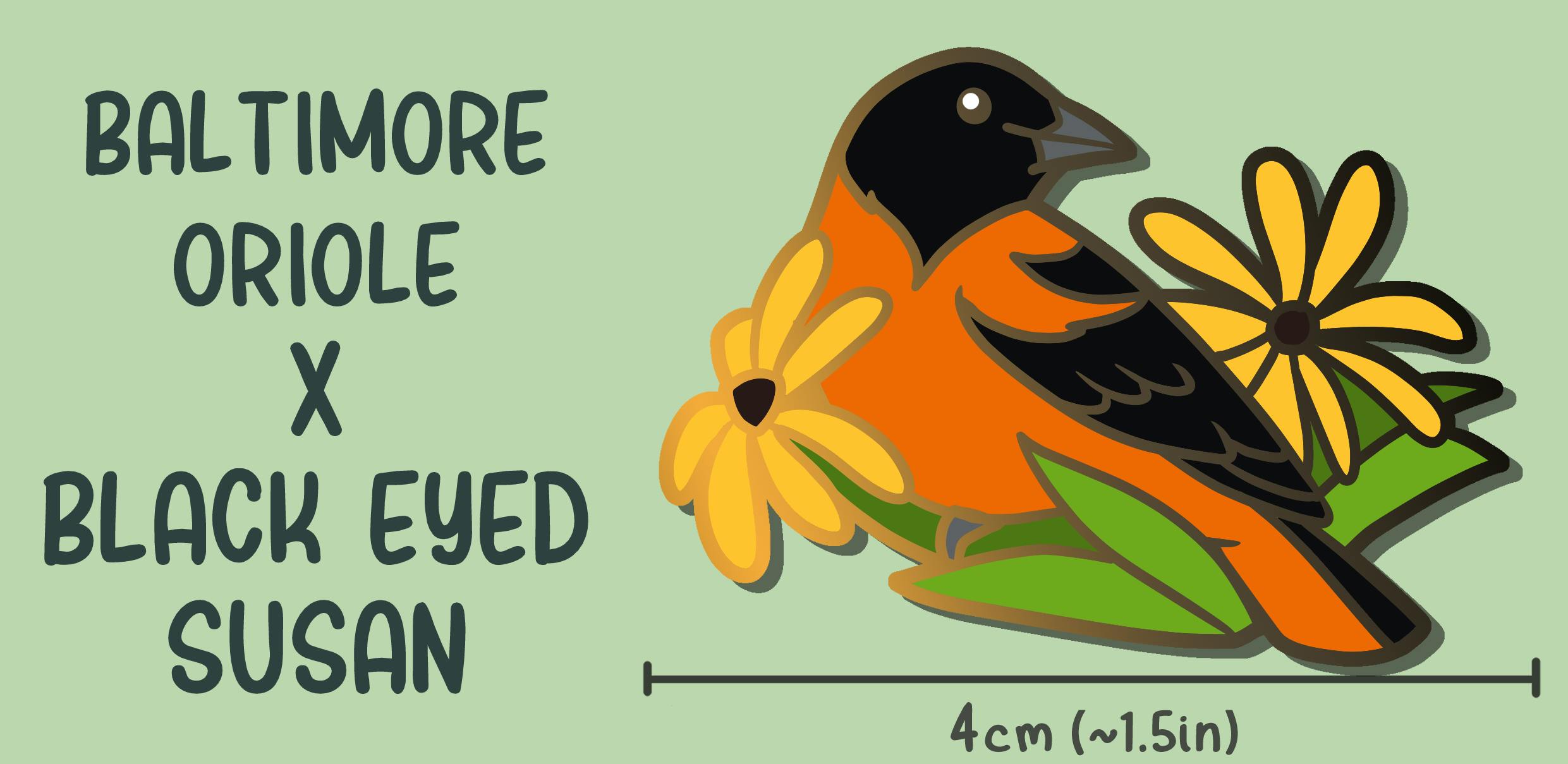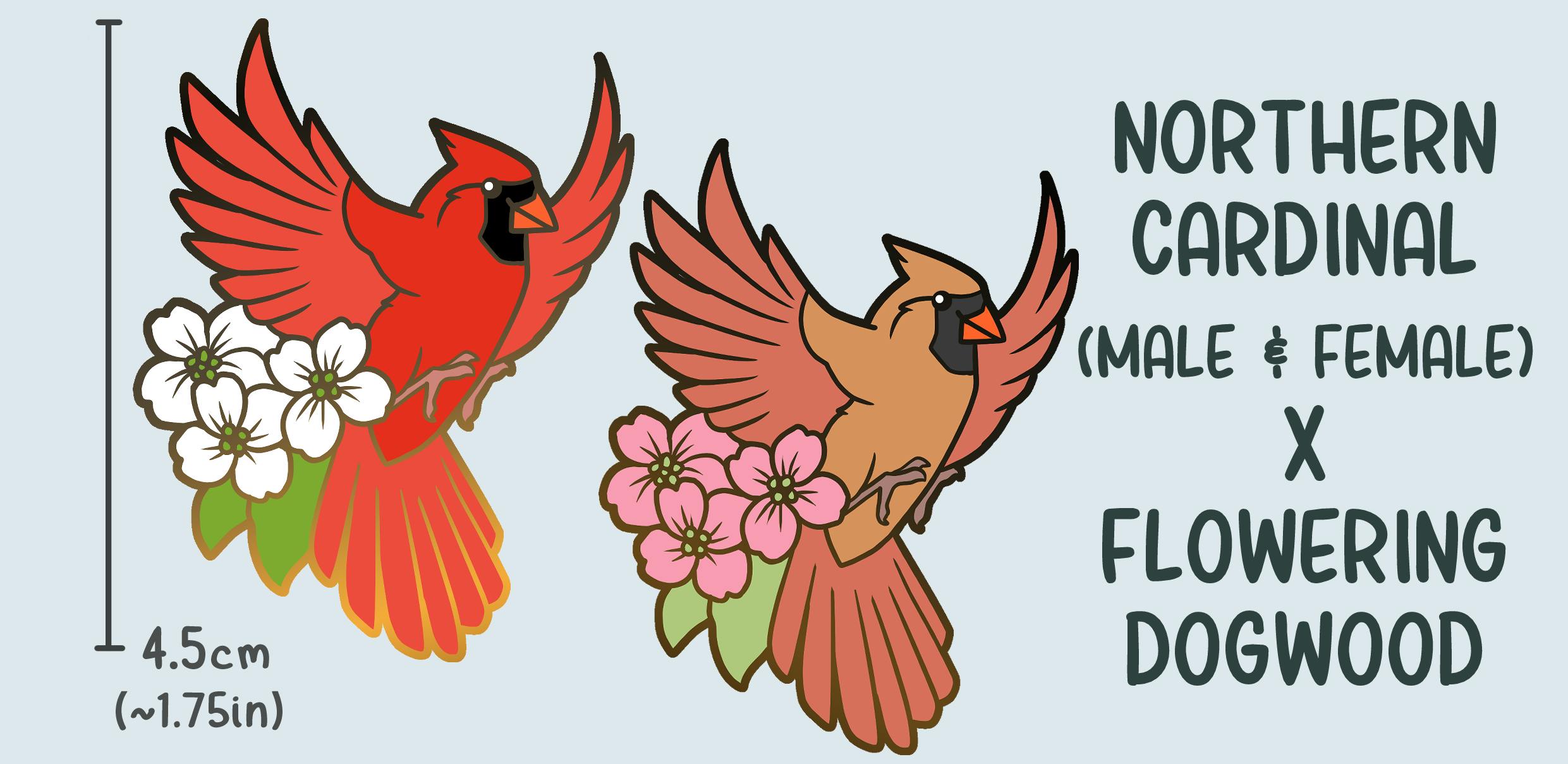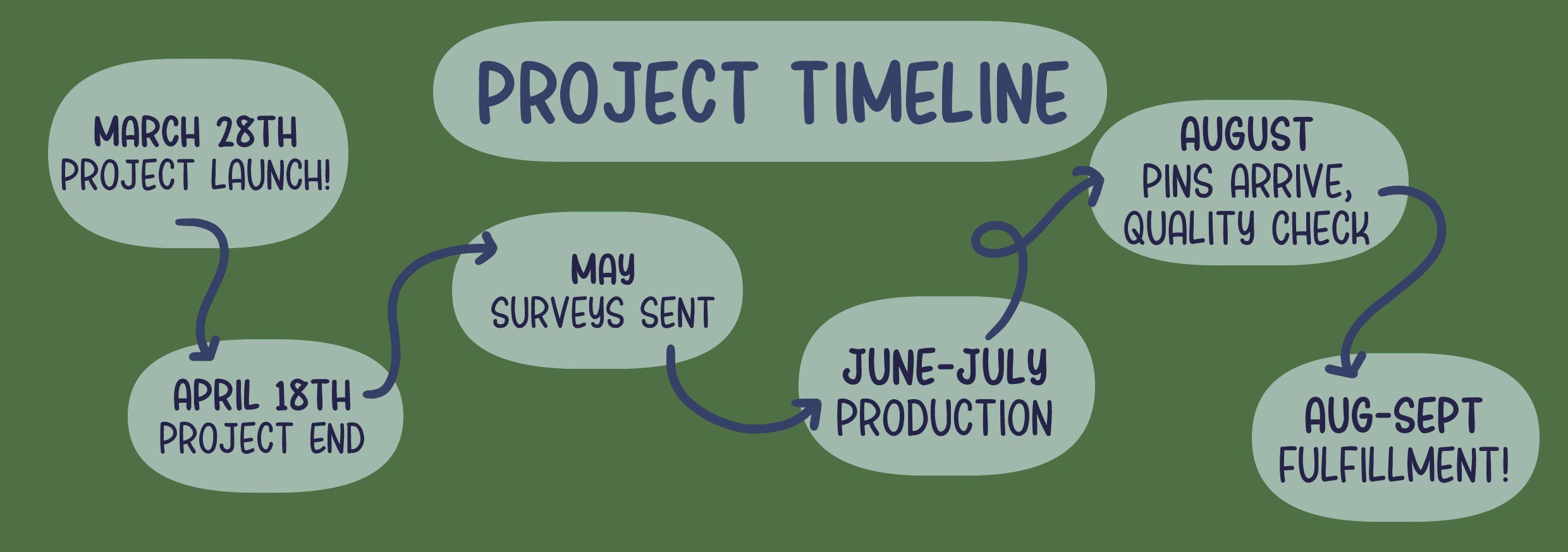 All pins for this project will be produced with hard enamel with gold metal plating and 2 posts. They will be packaged on custom designed backing cards for this project. All main pins will be approximately 4-5cm (1.5-1.75in).