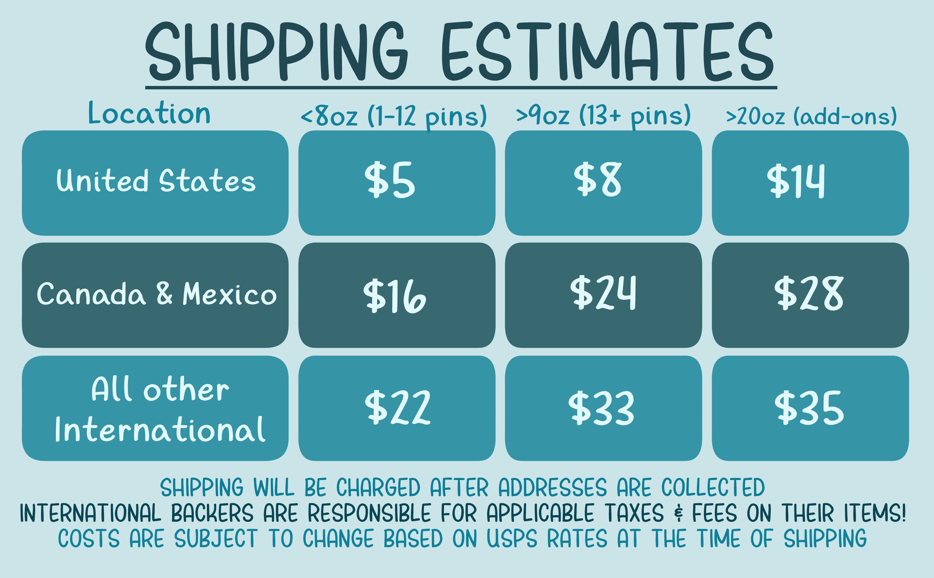 Please note that shipping will be calculated and collected after the campaign has ended through the Pledge Manager. During this step you will choose which pins you want, add on additional items, and provide your mailing address. You can check out the estimated shipping table in the Shipping section below.