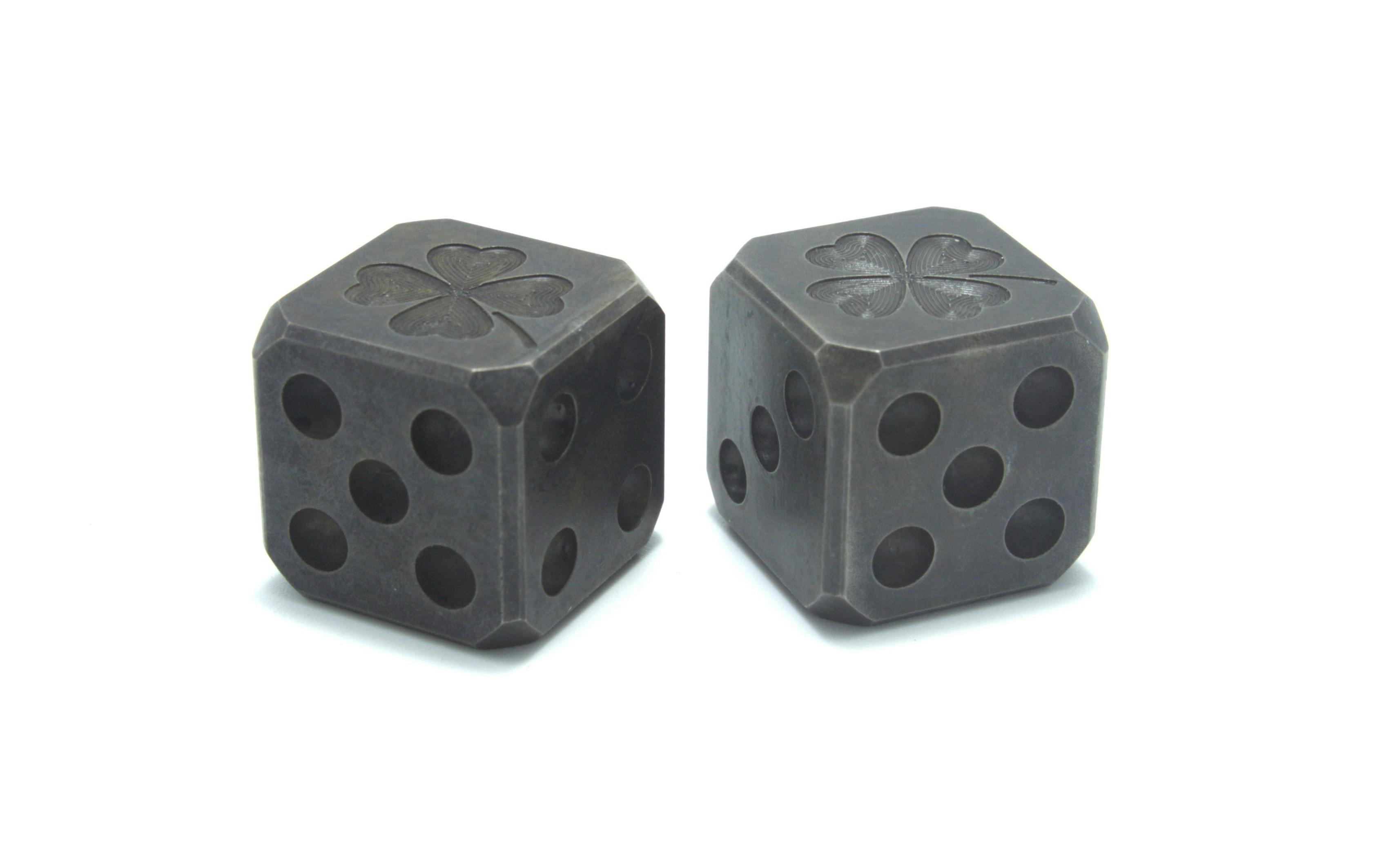 Darkside Tungsten copper dice CNC machined from solid billet. Hand sanded, blasted, acid burned, and stone washed for a darkened variegated almost wet look finish. The popular Shamrock version added!
