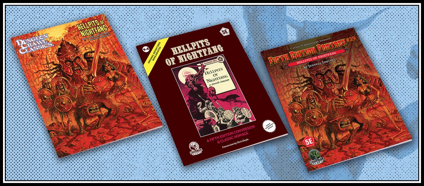 Also offered with this crowdfunding: Jennell Jaquays' iconic vampire adventure. In The Hellpits of Nightfang, the characters battle the vampire Nightfang in the sunken chambers of the Hellpits! Available in a special crowdfunding OAR-edition cover featuring original Jaquays cover art! Also available in DCC edition, or regular FEF cover.