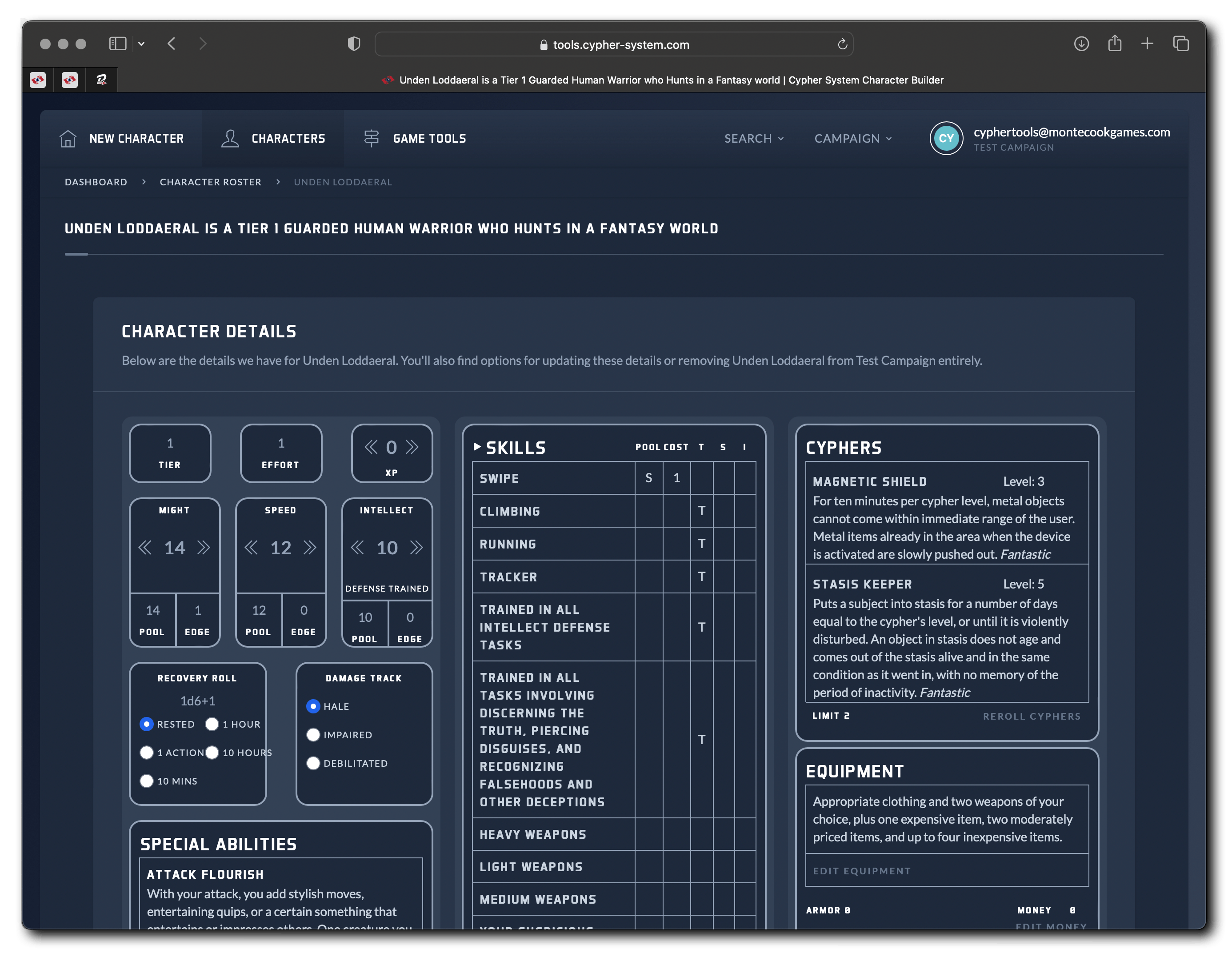 Build, store, advance, maintain, edit, and even share Cypher System characters online with this free tool. There are multiple modes for creating characters—the Guided mode, in particular, is super fast and easy. It takes you through the process step-by-step. You can build a character in literally three or four minutes.