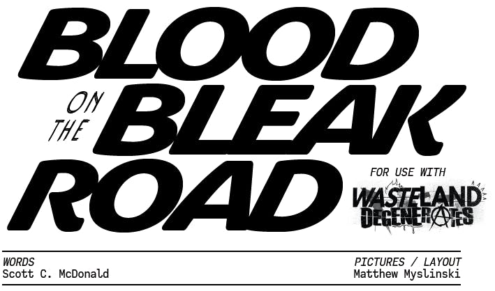 Oh yes, and keep your eyes on the road: The sequel to my solo game set in the Wasteland Degenerates universe, Enter the Dismal Armory, is just around the corner. Watch for Blood on the Bleak Road, an epic cross-country highway murder-venture, on my Itch page!
