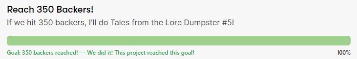 That didn't take long... let's make it a little more challenging, just for the sake of my carpel tunnel. 350 sounds like a good number! Anyway, enjoy Lore Dumpster #4 in the Backers-only section!