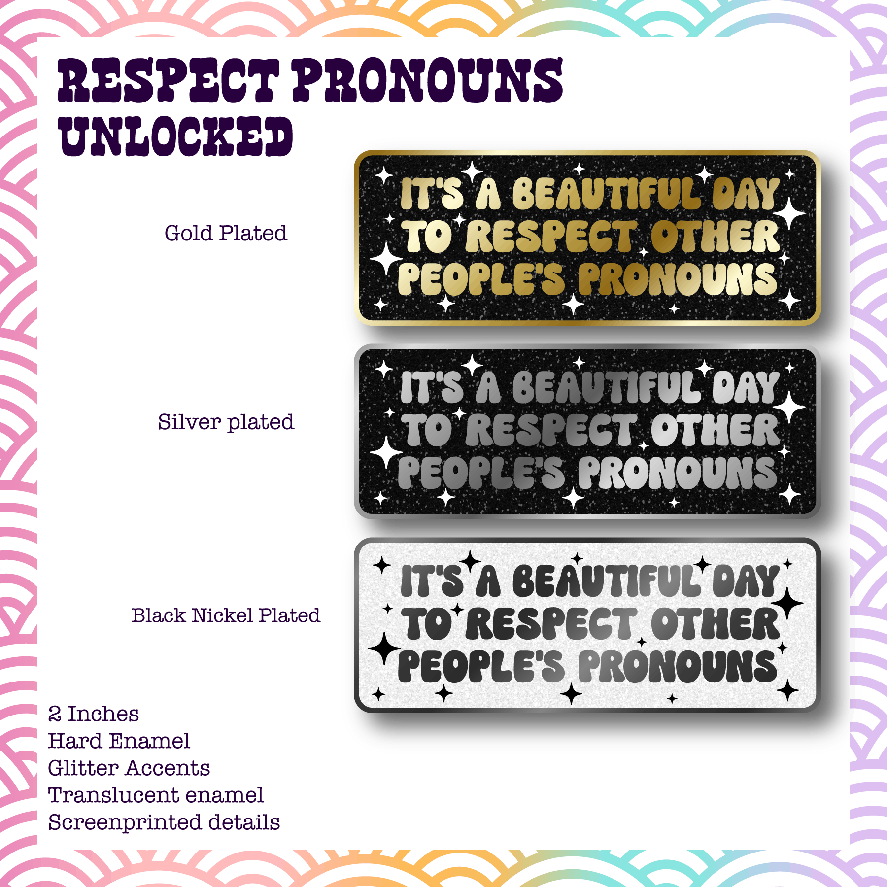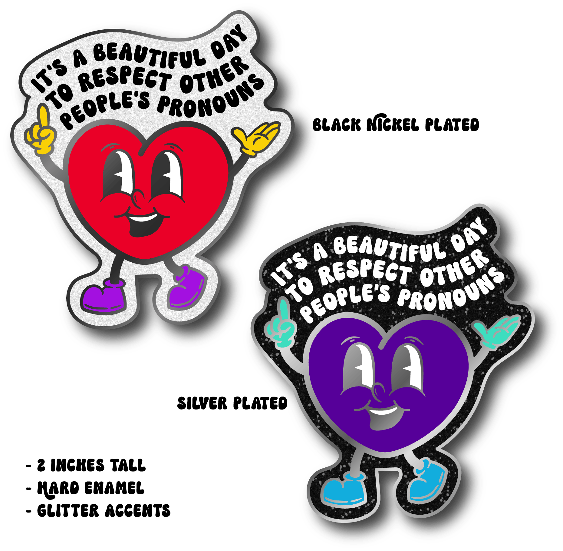 For those of you who aren't a fan of the retro character, you can get the same saying on a simpler design. The respect Pronouns design comes in either a silver or gold plated with black glitter, or a black nickel plated with white glitter. The stars on each of these designs are screen printed.