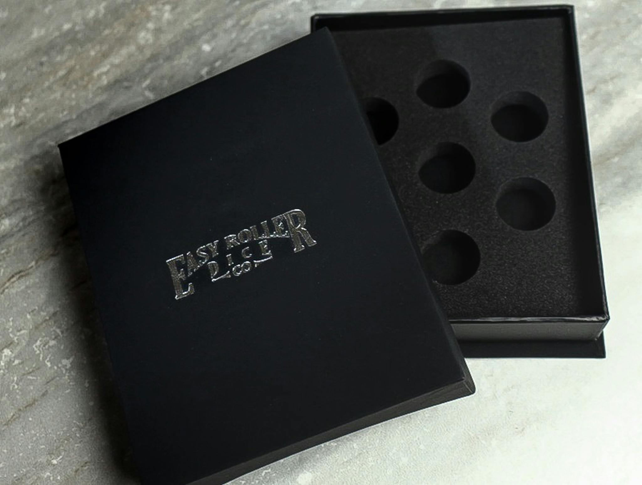 Each dice set on this campaign comes in a beautiful Easy Roller Dice storage and 7-piece display box. This box helps protect your Dice of Fire & Ice glass from damage when not in use.
