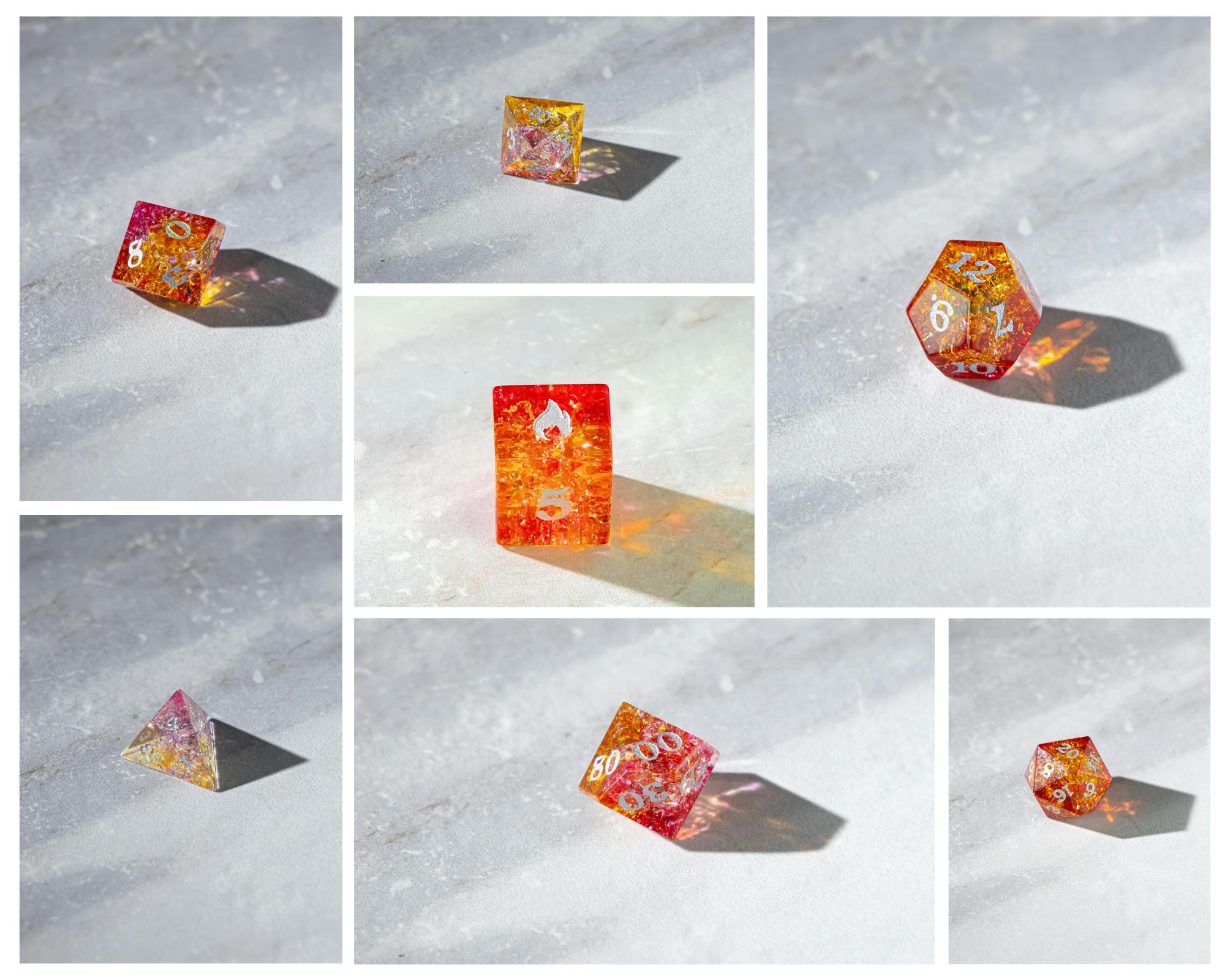 Dice of Fire NOTE:  The D4 and D8 may be a lighter color than the rest of the set. Since these are natural, the tones on those particular dice are lighter due to the fine cut. You can see these differences in the images.