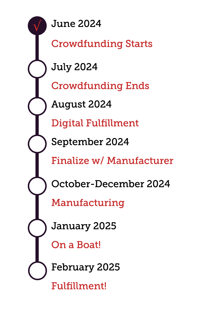 Once we have successfully funded, we will push forward on the following schedule to complete the project. The game is finished and has had advanced prototypes made, but we have built a little slack into this to account for the current and perennial problems with international manufacturing, freight, and shipping: