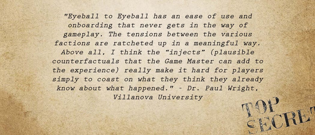 For a look at a full Eyeball to Eyeball playtest in action, check out The Reacting Consortium's Facebook live stream of Eyeball to Eyeball from their Annual Institute in early June: https://fb.watch/sQxHoqkGTK/