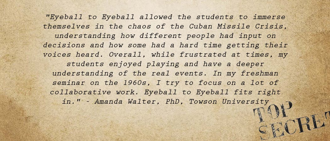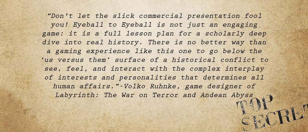 Eyeball to Eyeballhas been played in colleges, service academies, high schools, and wargame conventions. Whether you’re looking for a classroom exercise to deepen student understanding of Cold War dynamics; a group development exercise in organizational engagement; or an engaging Cold War simulation/parlor LARP, Eyeball to Eyeballoffers a unique opportunity to relive and understand the past.