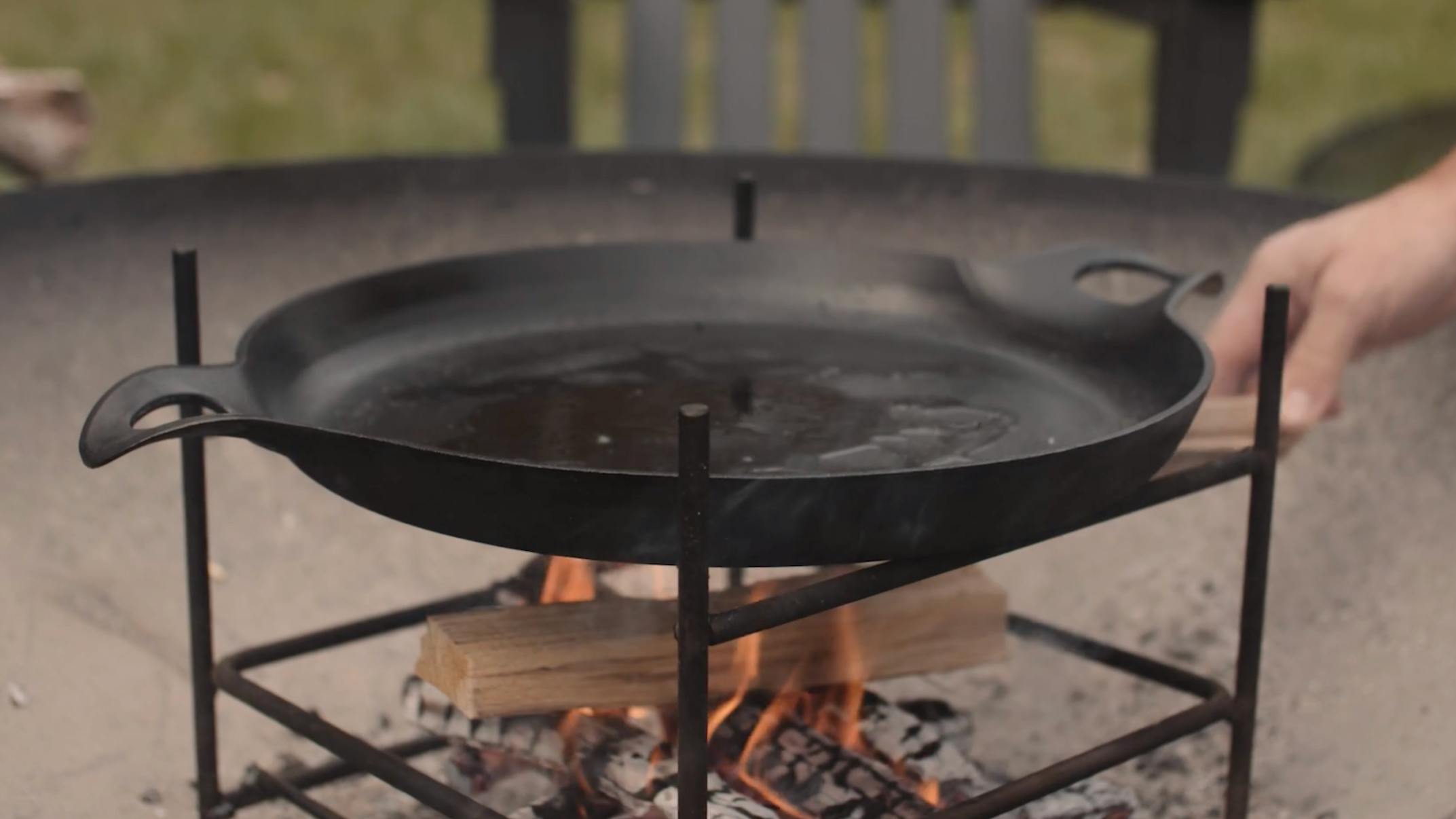 Our cast iron paella pan is sized to fit the Fire Pit Grill and works as a plancha, a comal, a griddle, a roaster, and a serving dish. It features a smooth-machined cooking surface and pre-seasoning for minimal sticking and easy cleaning.