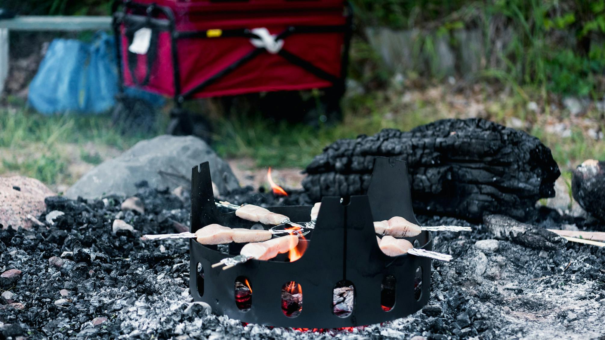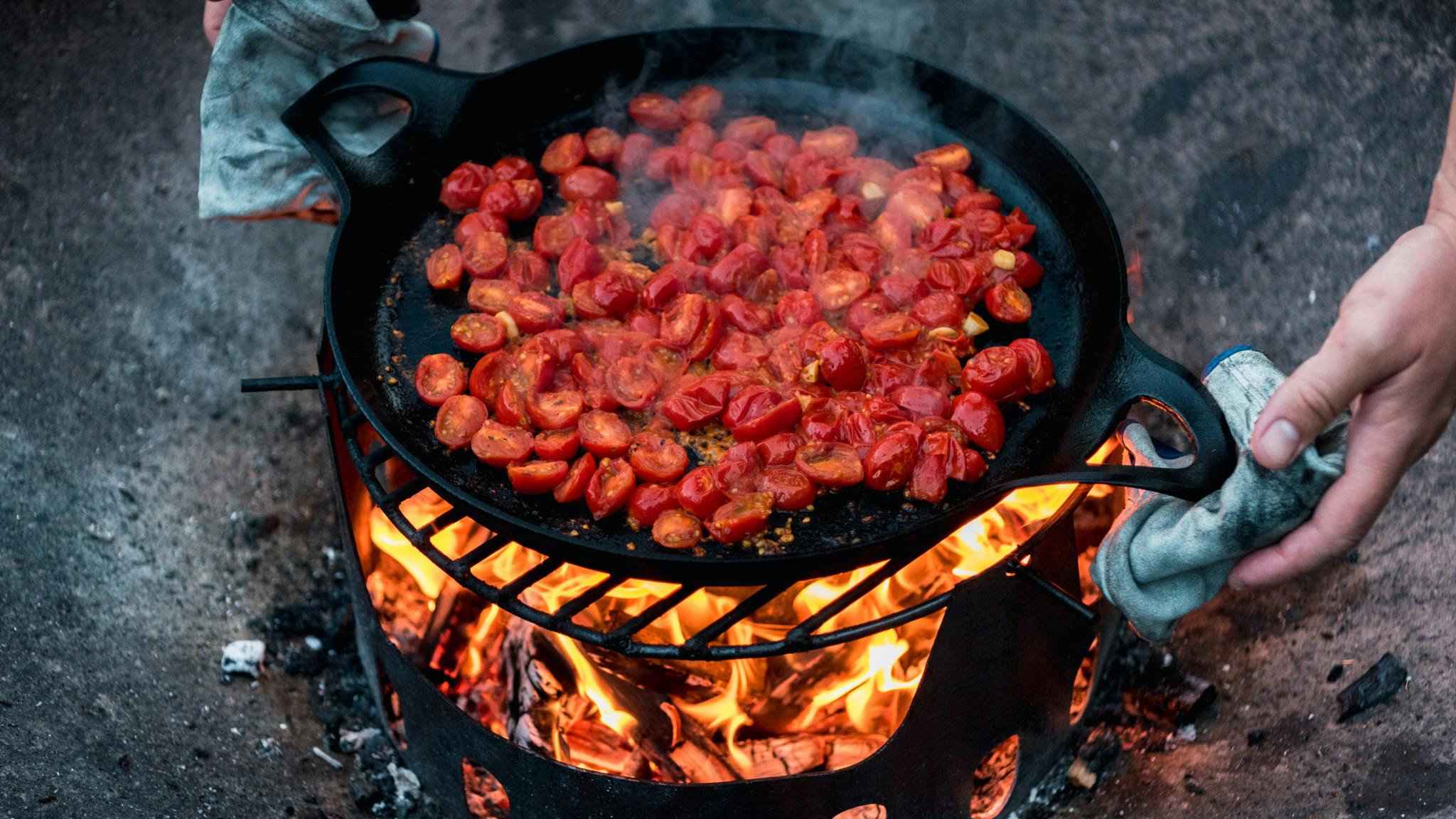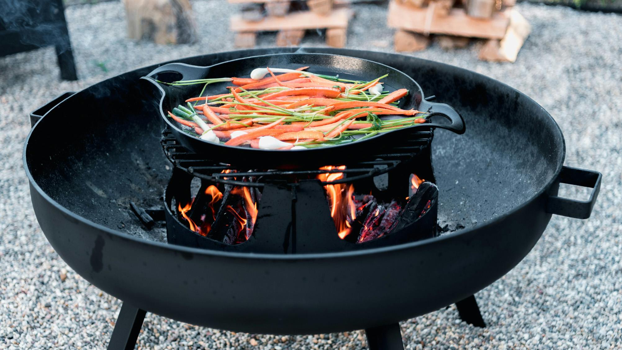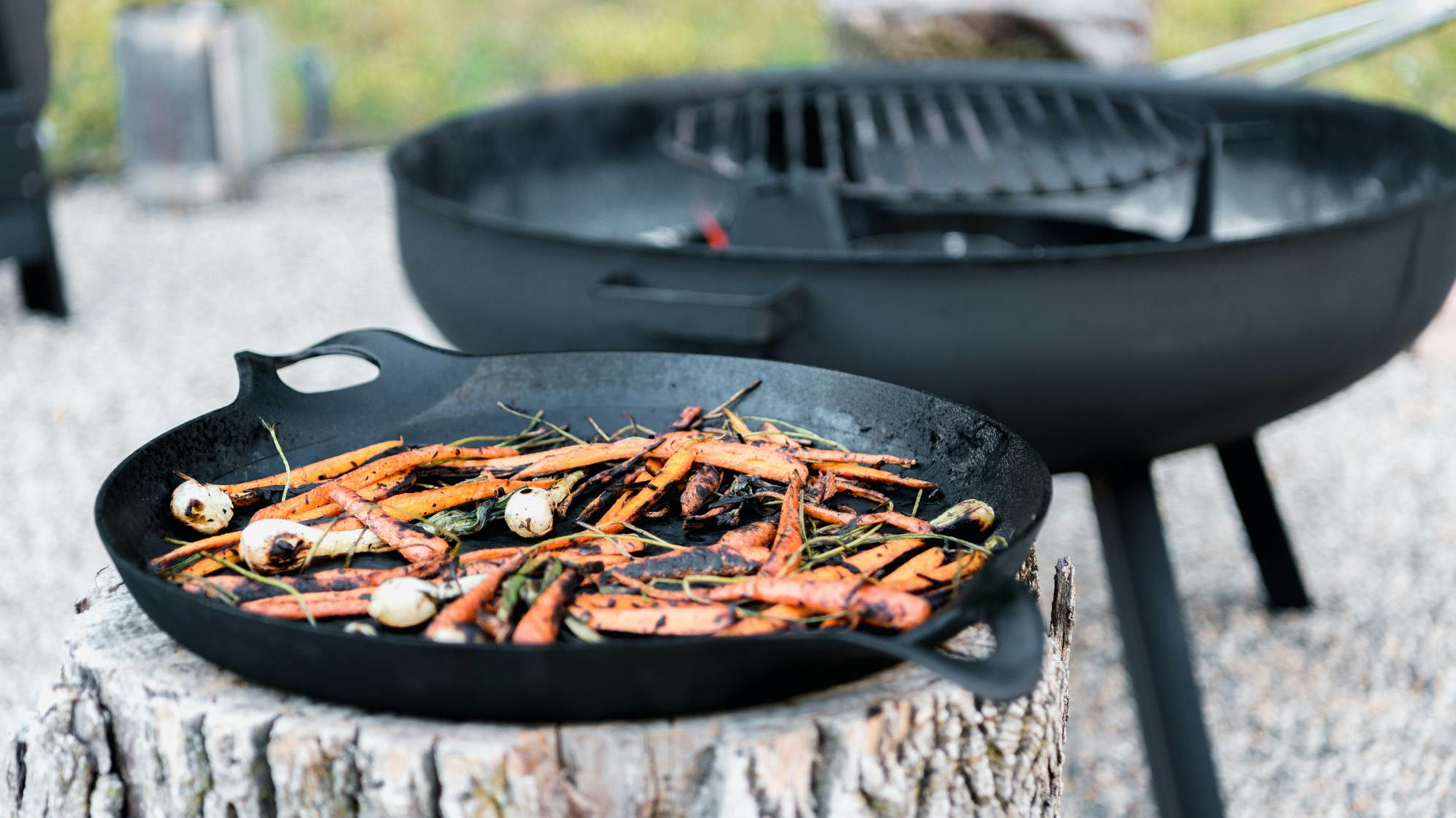Super-hot direct flames in combination with cast iron makes for a perfect searing station (optional cast iron Fourneau Paella Pan)