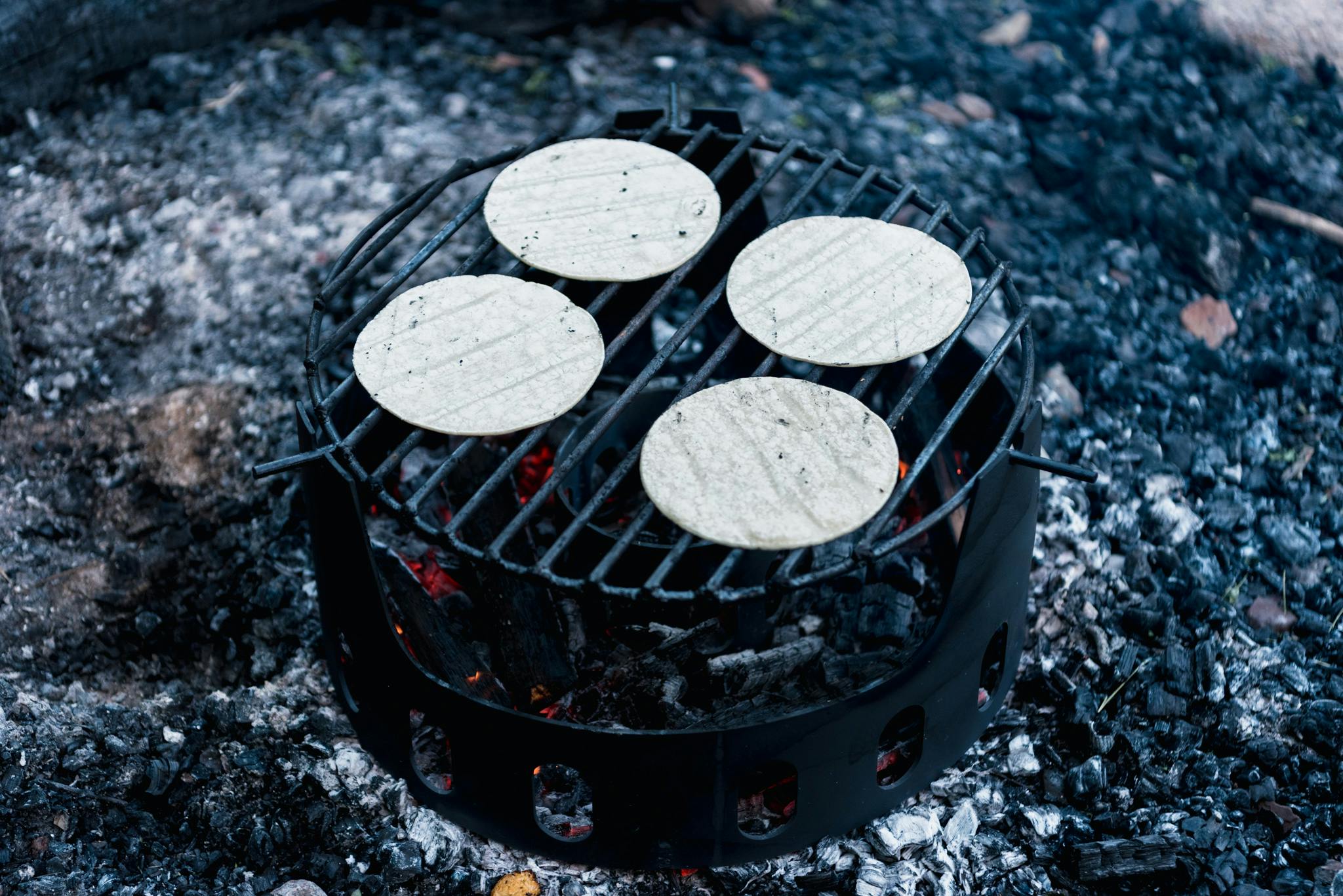 Heating tortillas over hardwood embers for a camp site taco feast
